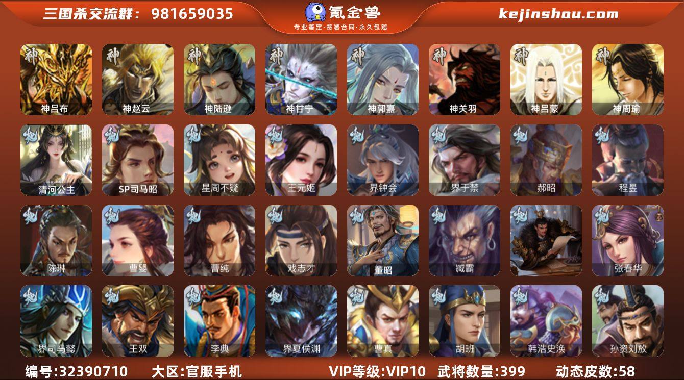 【4364】官阶:大将军;VIP等级:VIP10;史诗武将数量:48;动态皮肤数量:58;武将总数:399;史诗宝珠数量:0;将魂数量:0;神将:5;魏国史诗武将:38;蜀国史诗武将:11;吴国史诗武将:3;群史诗武将:18