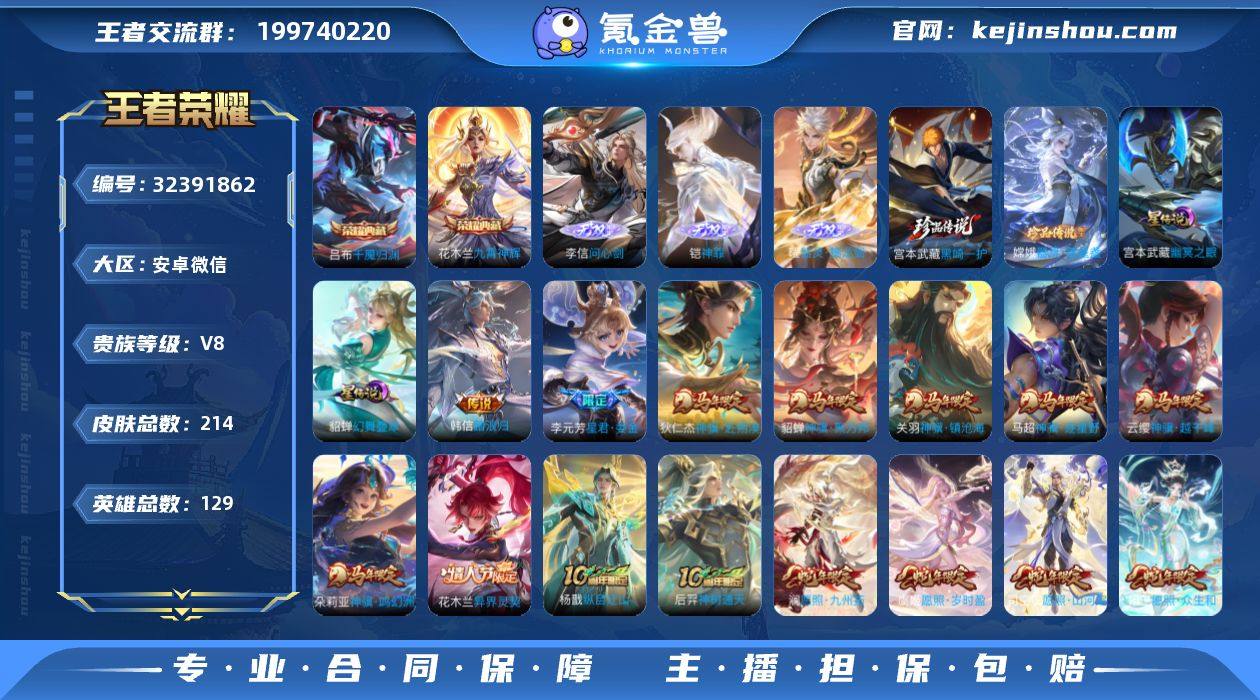 安卓Q-V6-最强王者段位-127英雄-399皮肤-4典藏皮肤-1典藏英雄-1无双-29传说-126史诗 【英雄全皮】:刘邦全皮,娜可露露全皮,金蝉全皮,空空儿全皮,影全皮 【荣耀典藏】:武则天英雄,小乔天鹅之梦,芈月大秦宣太后,貂蝉幻阙歌,瑶拾光映像 【无双皮肤】:小乔时之魔女 【传说皮肤】:妲己愿照众生和,桑启鸣野蒿,貂蝉曦玄引,不知火舞绯月行,王昭君星穹之声,娜可露露前尘镜,孙尚香音你闪耀,瑶时之祈愿,裴擒虎寅虎赤拳,鲁班七号寅虎瑞焰,王昭君乞巧织情,周瑜音你心动,小乔音你心动,李元芳飞鸢探春,公孙离祈雪灵祝,诸葛亮时雨天司,镜炽阳神光,虞姬启明星使,李信一念神魔,刘备时之恋人,伽罗太华,貂蝉猫影幻舞,干将莫邪久胜战神,虞姬云霓雀翎,后羿黄金射手座,诸葛亮武陵仙君,貂蝉仲夏夜之梦,孙尚香末日机甲,武则天海洋之心 【限定皮肤】:白起狰,姜子牙天穹之誓,狄仁杰阴阳师,虞姬凯尔特女王,廉颇寅虎御盾,赵云皇家上将,妲己热情桑巴,妲己时之奇旅,嬴政白昼王子,鲁班七号狮舞东方,鲁班七号寅虎瑞焰,高渐离死亡摇滚,阿轲迷踪丽影,钟无艳超时空战士,孙膑天狼运算者,孙膑寅虎展翼,扁鹊炼金王,扁鹊奇幻香踪,芈月重明,芈月白晶晶,芈月幻夜卜梦,吕布猎兽之王,周瑜赤莲之焰,元歌云间偶戏,夏侯惇朔风刀,甄姬幽恒,甄姬游园惊梦,甄姬落雪兰心,曹操烛龙,曹操天狼征服者,典韦穷奇,典韦蓝屏警告,马可波罗暗影游猎,狄仁杰魔术师,狄仁杰万华元夜,达摩星际陆战队,达摩沙漠行僧,项羽海滩派对,项羽霸王别姬,老夫子醍醐杖,貂蝉逐梦之音,安琪拉魔法小厨娘,程咬金演武夺筹,露娜一生所爱,刘邦夺宝奇兵,王昭君凤凰于飞,王昭君午后时光,王昭君星穹之声,兰陵王驯魔猎人,兰陵王金庭之子,不知火舞绯月行,娜可露露前尘镜,亚瑟潮玩骑士王,孙悟空大圣娶亲,牛魔...
