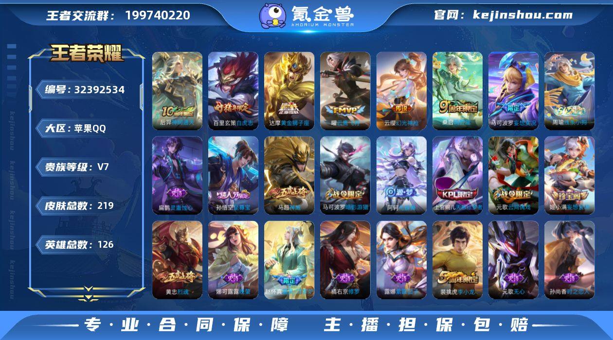 实名: 可修改 贵族等级: V7 英雄数: 126 皮肤数: 219 传说皮: 黄金狮子座,云鹰飞将,妄想实况,幻光神枪,神树通天 限定皮: 李小龙,梁祝,烈魂,神威,天狼绘梦者,白虎志,至尊宝,五谷丰年,神器·万象笔,鸣野蒿