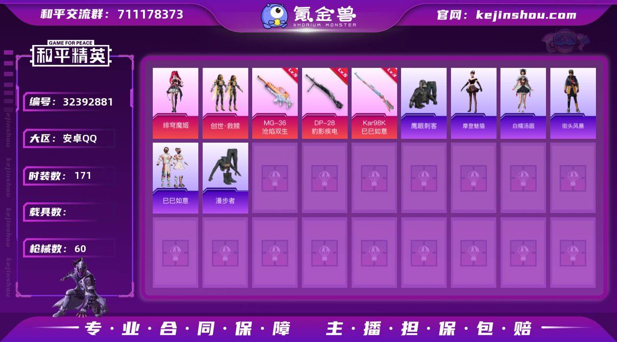 【5特效枪2粉装浪漫天命激萌罗小黑 秒换绑不用等】 安卓Q区-25176热力值-84套装-86枪皮 【2粉装】 角色-冷漠罗丽 角色-异瞳寒姬【5特效枪】 Mk14-福马献瑞(1级) 野牛-流星咚咚(5级) Kar98K-巳巳如意(4级) Mk14-甜梦熊击(5级) DP-28-豹影疾电(5级)【86热门】 浪漫天命 梦魇先生 激萌罗小黑 极速红龙 狂沙舞者 白色伏地魔 SS22特训 Kar98K-王子的夏天 SCAR-L-玉兔迎春 M762-天降萌叽 Mk47-乌木金纹 UZI-娇憨猪猪 M416-夜灯 UMP45-蓝色火焰 MG3-幻世战舞者 AKM-虎虎生威 GROZA-异彩先驱 AUG-灵符少年 长空猛禽 异彩先驱 夏日倾情 特训学院 青年教官 牛气冲天 霓虹街区 霓虹极客 魅力单车 猎鹰 蓝色运动 橘黑制服 竞技达人朋克 黄色运动 漫步者 黄色伏地魔 红色运动 黑色伏地魔 海岛探路者 顶瓜瓜 GROZA-福马献瑞 SS34特训 朱霞炽焰 AWM-天降萌叽 SS18特训 大橘大利 SS17特训 彩虹兔 SS19特训 SS20特训 SS21特训 凌霄紫焰 龙魂突击队 海盐绵绵冰 M16A4-冰河战士 SS33特训 雪绒豹 老实芭蕉 JS9-凌霄紫焰 MG-36-凌霄紫焰 ARX-凌霄紫焰 云朵鹅 P92-凌霄紫焰 平底锅-凌霄紫焰 狙击之神 AKM-彩虹符号 UMP45-海盐豹豹 Mini14-炫彩节奏 M417-玩趣呆呆 平底锅-异彩先驱 平底锅-娇憨猪猪 UZI-冰河战士 烟雾弹-冰氧夏日 湖畔霞光 薄荷星砂 霓虹热舞 S12K-霓彩脉冲 VSS-香桃花海 DBS-幻彩电音 破片手榴弹-拽到爆炸 SVD-云朵鹅 M762-云朵鹅 SPAS-12-云朵鹅 SCAR-L-海盐豹豹 沙漠之鹰-云朵鹅 云魄琉璃 大砍刀-云朵鹅 白糯汤圆【12背包】 异彩先驱背包(3级) 冰河战士背包(3级) 破晓战魂背包(3级) 香桃花海背包(3级) 月影灵韵背包(3级) 异域银装背包(3级) 巳巳如意背包(3级) 云朵鹅背包(3级) 凌霄紫焰背包(3级) 喜羊羊与灰太狼背包(3级) 虎虎生威背包(3级) 玉兔迎春背包(3级) 营地ID:784453113