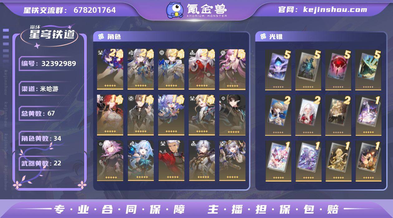 星琼数量: 167 总黄数: 67 五星光锥数: 22 五星角色数: 34 开拓等级: 70 开拓者性别: 男 2命金色角色: 2命希儿,2命布洛妮娅,2命克拉拉,2命杰帕德 1命金色角色: 1命彦卿,1命白露,1命姬子,1命瓦尔特,1命符玄 0命金色角色: 0命银狼,0命罗刹,0命卡芙卡,0命镜流,0命托帕&账账,0命藿藿,0命阮•梅,0命真理医生,0命花火,0命黄泉,0命知更鸟,0命流萤,0命灵砂,0命云璃,0命星期日,0命忘归人,0命阿格莱雅,0命遐蝶,0命风堇,0命赛飞儿,0命白厄,0命Archer,0命刻律德菈,0命长夜月,0命丹恒·腾荒 精5武器: 精5记忆的质料,精5孤独的疗愈,精5记一位星神的陨落,精5星海巡航 精2武器: 精2如泥酣眠,精2制胜的瞬间,精2无可取代的东西 精1武器: 精1以世界之名,精1但战斗还未结束,精1雨一直下,精1只需等待,精1此身为剑,精1镜中故我,精1行于流逝的岸,精1梦应归于何处,精1落日时起舞,精1唯有香如故,精1将光阴织成黄金,精1记忆永不落幕,精1让告别,更美一些,精1愿虹光永驻天空,精1致长夜的星光
