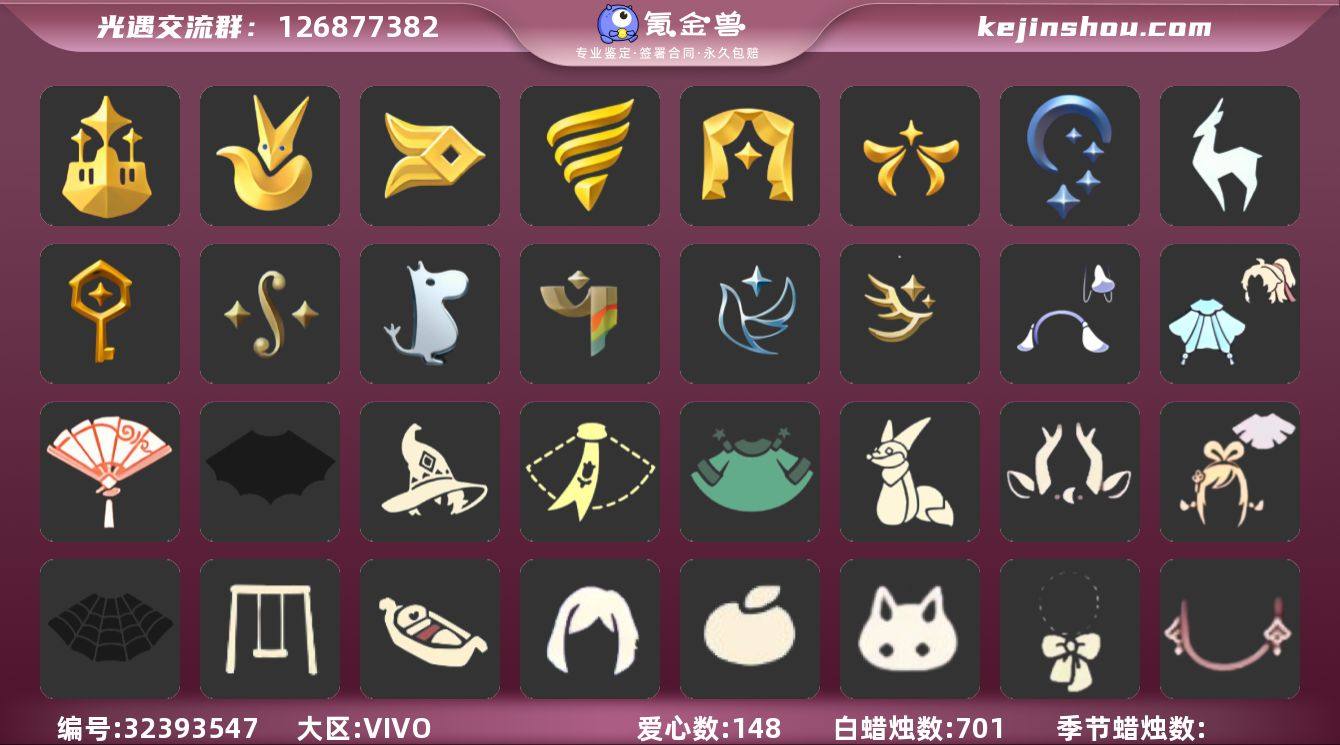账号类型: 手机账号 季节已毕业: 梦想季,小王子季,风行季,潜海季,表演季,欧若拉季,夜行季,九色鹿季,筑巢季,二重奏季,姆明季,彩染季,青鸟季,迁徙季 完成地图: 晨岛,云野,雨林,霞谷,暮土,禁阁 珍稀物品: 白枭,透明蝶翼斗,玫瑰花 礼包: 蝙蝠套,巫师,围巾,星球斗,小狐狸,九色鹿角,绊爱,蜘蛛斗,秋千,小船,奔跑发型,橘子,兔子,蝴蝶结,新年耳钉,献瑞折扇礼包,青衫落拓礼包,活力海牛礼包 裤子: 武士裤,背带裤,搓澡巾,妮妮裙子,王子服,蓝绿裤,飞天裤,筑巢季·裤子,青鸟尊贵蓬头裤子 面具: 凤凰面具,贴花面具,呼吸面具,夜行毕业面具,黄眉企鹅面具,辉光羚羊面具 面饰: 红耳机,黑框眼镜,青鸟毕业面饰 发型: 若笠,虚荣,单侧绑发,小王子发型,留辫蘑菇头,飞天盘发 头饰: 行军锅头盔,羽毛发饰,蓝色音乐会,平顶帽 斗篷: 海洋斗,蟑螂斗,绿芽,粉红绒毛斗篷,燕尾斗篷,彩染围巾斗篷,青鸟毕业斗篷 配饰: 雨伞,筑巢季·小手办,高音钢琴,姆明抱枕,小红伞,相机,玫瑰花,二重奏挂画,蓝色手碟 亮点: 【优质装备】:表演季,白枭(帝企鹅发),武士裤,梦想季,小王子季(王子季),风行季,潜海季,透明蝶翼斗,欧若拉季(欧若拉),行军锅头盔(六边锅帽子)(双耳锅帽子),羽毛发饰(多羽发饰),筑巢季·小手办(光之子试衣),高音钢...