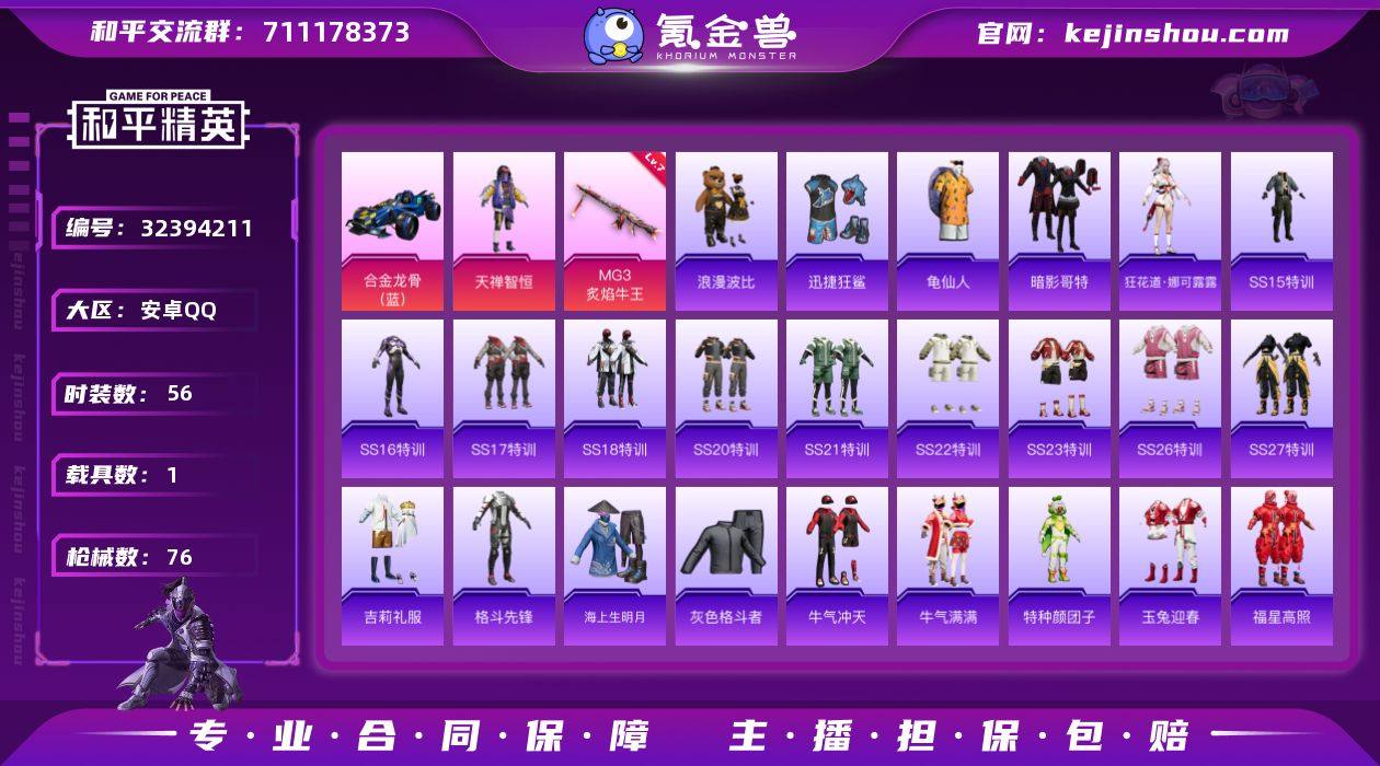 安卓 手Q-1粉装-1特效枪-1载具-0粉色飞行器-23705热力值-2王牌印记-56套装-76枪皮 QW2631509 【热门品类】:套装-龟仙人,套装-暗影哥特,套装-浪漫波比 【粉色套装】:粉装-天禅智恒 【粉色枪皮等级】:MG3-炙焰牛王(七级) 【粉色载具】:合金龙骨(蓝) 【粉色枪皮】:MG3-炙焰牛王 【粉色降落伞】:海渊国主降落伞 【稀有套装】:套装-龟仙人,角色-狂花道·娜可露露 【稀有枪皮】:AKM-萌趣颜团子,AKM-虎虎生威,AKM-龙的传人,M16A4-幻世战舞者,M16A4-莲影清波,SCAR-L-炫彩节奏,SCAR-L-玉兔迎春,SCAR-L-红色方程式,SCAR-L-黄金龙骨,M416-糯团青竹,M416-红色方程式,M416-蓝色火焰,GROZA-彩虹符号,AUG-青春冒险家,QBZ-彩虹符号,M762-天降萌叽,M762-瑞龙福将,M762-风花雪月,Mk47-青春冒险家,G36C-时空追击者,AC-VAL-天降萌叽,AC-VAL-快闪甜心,蜜獾-娇憨猪猪,UZI-啾咪啾咪,UZI-娇憨猪猪,UZI-炫彩节奏,UMP45-时空追击者,UMP45-生命誓言,Vector-彩虹符号,汤姆逊-奇异狩猎者,野牛-青春冒险家,P90-快闪甜心,Kar98K-王子的夏天,M24-奇异狩猎者,SKS-时空追击者,SKS-炫彩节奏,SKS-金玉无双,Mini14-炫彩节奏,Win94-瑞龙福将,SLR-娇憨猪猪,QBU-...