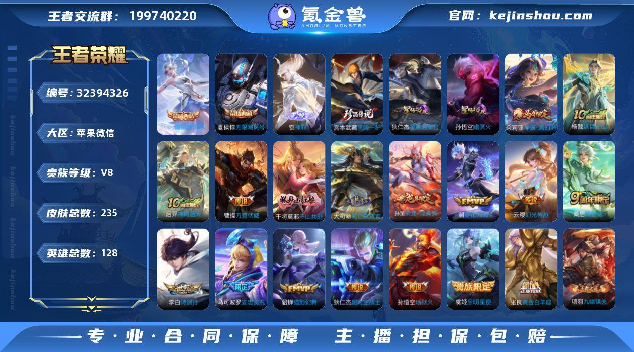 苹果Q-V8-最强王者段位-129英雄-273皮肤-1典藏英雄-2无双-4珍品传说-28传说-65史诗 【英雄全皮】:空空儿全皮 【荣耀典藏】:武则天英雄 【无双皮肤】:曜器灵螭龙剑,小乔时之魔女 【珍品传说】:宫本武藏黑崎一护,暃朽木白哉,嫦娥器灵落星盏,孙策时之奇旅 【传说皮肤】:杨玉环星之鸣奏,后羿千劫归真,司空震愿照山河定,澜愿照九州拓,云缨幻光神枪,裴擒虎祥瑞亨通,嬴政玄雷天君,桑启鸣野蒿,铠冥王哈迪斯,露娜霜月吟,李白诗剑行,不知火舞绯月行,百里守约碎云,孙尚香音你闪耀,马超无双飞将,赵云淬星耀世,王昭君乞巧织情,西施游龙清影,镜炽阳神光,虞姬启明星使,曜云鹰飞将,李信一念神魔,张良黄金白羊座,干将莫邪久胜战神,花木兰冠军飞将,后羿黄金射手座,貂蝉仲夏夜之梦,武则天海洋之心 【限定皮肤】:白起狰,铠冥王哈迪斯,暃埋骨钱,蒙犽顽岩魄,蔡文姬夏日便利店,大乔绒语心约,虞姬夏日便利店,姜子牙天穹之誓,狄仁杰阴阳师,虞姬凯尔特女王,赵云皇家上将,嬴政白昼王子,高渐离玩趣恶龙,阿轲迷踪丽影,钟无艳超时空战士,孙膑妖精王,扁鹊炼金王,芈月重明,芈月白晶晶,吕布猎兽之王,元歌无心,夏侯惇朔风刀,甄姬落雪兰心,曹操烛龙...