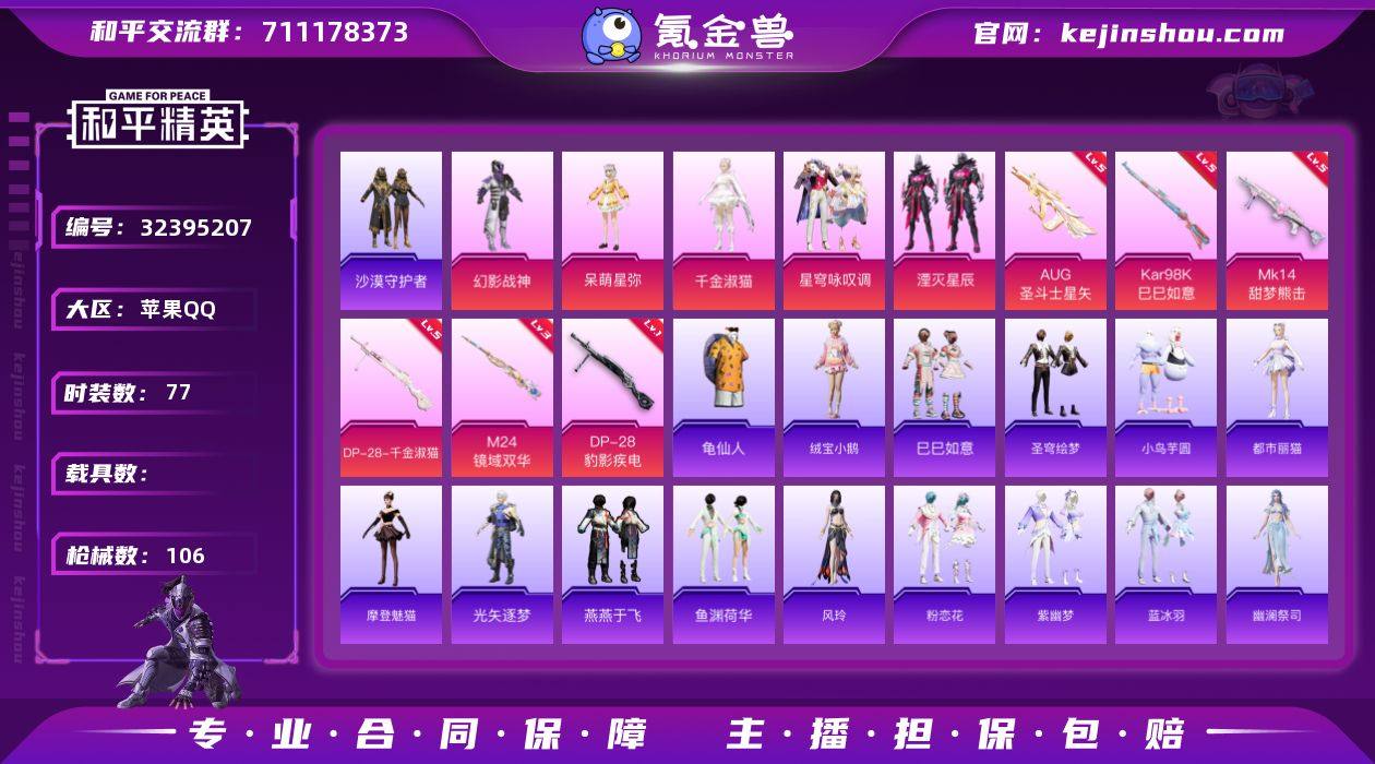 苹果 手Q-3粉装-6特效枪-1载具-1粉色飞行器-38875热力值-4王牌印记-77套装-128枪皮 【热门品类】:套装-浪漫天命,套装-胖达圆圆,套装-龟仙人 【粉色套装】:角色-洛天依,角色-狂花道·不知火舞,粉装-星穹咏叹调 【粉色枪皮等级】:AKM-绿萝繁花(五级),AKM-魔法神域(三级),M762-青锋波束(五级),Kar98K-巳巳如意(五级),DP-28-豹影疾电(五级),爆炸猎弓-拳皇·狂花道(七级) 【粉色载具】:合金龙骨(蓝) 【粉色枪皮】:AKM-绿萝繁花,AKM-魔法神域,M762-青锋波束,Kar98K-巳巳如意,DP-28-豹影疾电,爆炸猎弓-拳皇·狂花道 【粉色飞行器】:深渊漩涡飞行器 【粉色降落伞】:未来歌姬降落伞,炫光之旅降落伞,莲影清波降落伞,创世·救赎降落伞,金丰海韵降落伞,时空协奏降落伞,拳皇·狂花道降落伞,千金淑猫降落伞,樱桃泡泡降落伞 【稀有套装】:套装-龟仙人,套装-巳巳如意,套装-雏菊兔兔,套装-萝兰蝴蝶,套装-小熊娃娃,角色-狂花道·娜可露露,角色-狂花道·雅典娜,套装-糖糖葫芦,套装-青团波波,角色-都市丽猫,角色-临安公主,套装-鱼渊荷华,套装-旋风灵鼠,套装-星影赞美诗,套装-朱霞炽焰,套装-凌霄紫焰 【稀有枪皮】:AKM-彩虹符号,AKM-星之彼岸,AKM-龙的传人,M16A4-千金淑猫,SCAR-L-玫瑰恋情,M416-动感兔斯基,M416-彩虹嘻嘻猴,M416-糯团青竹,GROZA-影袭,GROZA-田园牧歌,AUG-耀粉歌者,AUG-闲梦青缨,M762-动感兔斯基,M762-天降萌叽,M762-第五大道,AC-VAL-快闪甜心,蜜獾-天降萌叽,Famas-墨龙九天,ARX-凌霄紫焰,UZI-啾咪啾咪,UZI-红色方程式,UMP45-猪猪侠,UMP45-生命誓言,UMP45-蓝色火焰,UMP45-绒宝小鹅,Vector-生命誓言,Vector-田园牧歌,汤姆逊-天降萌叽,汤姆逊-耀粉歌者,JS9-凌霄紫焰,P90-快闪甜心,Kar98K-红色方程式,AWM-圣堂之誓,AWM-恐龙拽拽,VSS-星之彼岸...