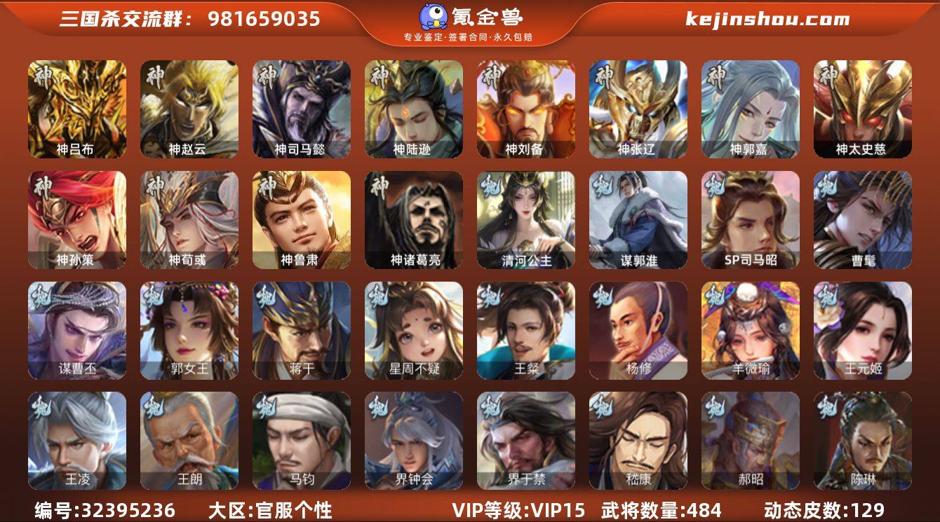 VIP等级: VIP15 官阶: 大将军 武将数量: 482 动态皮肤数量: 70 神将: 神甘宁,神郭嘉,神刘备,神陆逊,神吕布,神司马懿,神孙策,神太史慈,神荀彧,神张辽,神赵云,神吕蒙,神周瑜,神鲁肃,神华佗 魏国武将: 戏志才,曹纯,曹婴,陈琳,程昱,郝昭,嵇康,界曹真,界于禁,界钟会,马钧,魏-司马昭,王朗,王元姬,文鸯,杨修,王粲,唐咨-魏,张辽,SP蔡文姬,SP曹仁,SP关羽,SP贾诩,SP姜维,SP庞德,卞夫人,蔡贞姬,曹昂,曹操,曹冲,曹洪,曹丕,曹仁,曹叡,曹嵩,贾逵,王异,张恭,鲁芝,界满宠,曹休,界曹植,满宠,荀攸,王基,钟繇,蒯越蒯良,郭嘉,牵招,荀彧,杜畿,界郭嘉,崔琰,界曹丕,界荀彧,朱灵,界甄姬,吕虔,界王异,界许褚,界郭淮,华歆,陈群,界邓艾,界典韦,界曹休,谋甄姬,司马孚,袁涣,李通,乐进,辛宪英,郭淮,郭皇后,毌丘俭,夏侯惇,曹植,司马朗,谋于禁,界曹操,星周不疑,许褚,界张辽,谋徐晃,蒋干,张郃,钟会,文聘,曹彰,界夏侯惇,诸葛诞,司马懿,甄姬,杨阜,界徐晃,徐晃,界曹仁,孙资刘放,韩浩史涣,胡班,曹真,谋曹丕,典韦,界夏侯渊,谋荀彧,夏侯渊,李典,于禁,王双,邓艾,界司马懿,张春华,孟达-魏,臧霸,牛金,朱灵(国战),文钦-魏,谋夏侯惇,曹髦,成济,玄·毌丘俭,李昭焦伯,清河公主,司马伷,董昭,谋郭嘉,势董昭,谋夏侯渊 蜀国武将: 董允,关索,花鬘,界黄忠,谯周,沙摩柯,王平,张星彩,赵襄,周群,诸葛瞻,谋马超,谋赵云,谋夏侯氏,谋黄忠,马云騄,谋黄月英,徐庶,界魏延,杨仪,吕凯,界关羽,界诸葛亮,邓芝,界伊籍,胡金定,费祎,严颜,界黄月英,界张嶷,赵云,张松,彭羕,李丰,界刘备,谋法正,界刘禅,谋姜维,刘封,糜竺,李遗,谋庞统,黄月英,刘巴,关羽,王甫赵累,吴懿,吴班,界廖化,祝融,张飞,黄皓,魏延,界周仓,谋祝融,马忠,界法正,糜夫人,界孟获,刘禅,界赵云,谋诸葛亮,界姜维,张翼,关银屏,界祝融,SP孙尚香,SP徐庶,卧龙诸葛,宗预,周仓,简雍,谋孟获,界关兴张苞,诸葛亮,界张飞,界卧龙诸葛,法正,...
