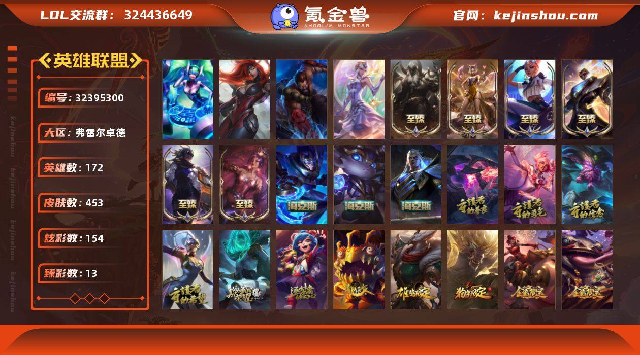 【LD5247】172英雄/453皮肤/4终极/16神话/79限定/13臻彩/154炫彩/72传说/116史诗/未定级/10周年 安妮/源代码 乐芙兰/暗星 科加斯/10周年庆典 凤凰/黎明使者 卡尔玛/星之守护者 塔莉垭/永恒之森 奥恩/海克斯 波比/海克斯 嘉文四世/海克斯 斯维因/至臻 真实伤害 奇亚娜/至臻 真实伤害 赛娜/至臻 剪纸仙灵 希维尔/至臻 K/DA 阿狸/至臻 未来战士 锤石/至臻 腥红之月 亚托克斯/冠军之志 瑞兹 凯旋圣装/霸天巨兽·雪崩 墨菲特/星之守护者 霞 烈羽/醒狮 克格莫/司马懿 仲达/南天之怒 沃里克/金猪烈焰 瑟庄妮/纳财大帝 塔姆/王国机神苍狼 瑟提/王国机神白虎 贾克斯/福牛守护者 厄斐琉斯/龙腾虎跃 瑟提/觅心魔灵 奥利安娜/冰雪风暴 希维尔/冬季仙灵 索拉卡/圣诞开心鬼 提莫/圣诞糖果棒 厄运小姐/“主人不要我了” 阿木木/平安夜女神 娑娜/冰雪节 茂凯/冬季仙境 发条/雪默丁格/圣诞玩偶 波比/圣诞老人 酒桶/圣诞驯鹿 克格莫/魄罗骑士 瑟庄妮/冰雪节 炼金/冰雪节 马尔扎哈/冰雪女神 辛德拉/北极星神 黛安娜/大元素使/DJ-娑娜/灵魂守卫/武装战姬/冠军典狱长 锤石/冠军之志 瑞兹/S1FNC 迦娜/S2 暗杀星 努努/S3 SKT T1 劫/S4 SSW 炼金/S4 SSW 图奇/S4 SSW 锤石/S5 SKT T1 阿利斯塔/S5 SKT T1 瑞...
