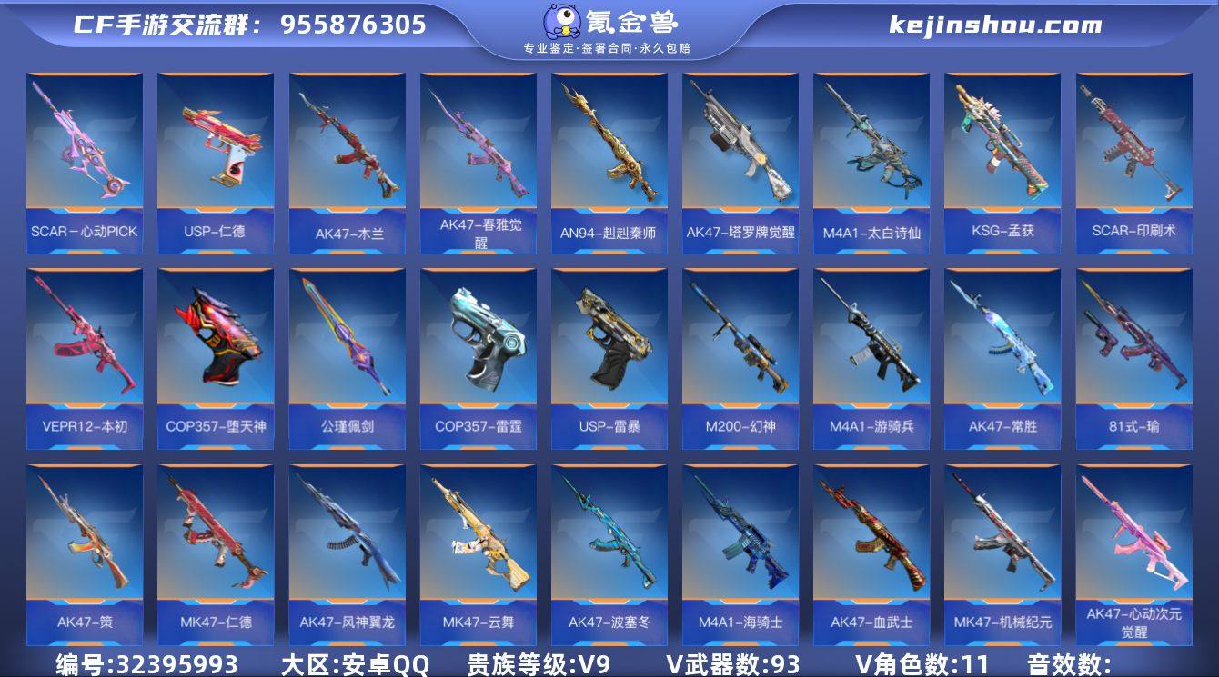 FC-ZXCWW44 安卓QQ,成人号:是,角色等级:170,实名:有修改人脸机会/实名是本人,段位:枪皇S,VIP等级:V8,V武器数量:523,V角色数量:11,V总数量:398,王者武器数:31,万化数量:590, 【人物角色】晴雅,蝴蝶,关小雨,瞳,堕天使,复仇者,曼陀罗,幻影,潘多拉,斯沃特,炽天使-X,凌霄,云悠悠-心动起点,蝉,麻雀,春,斯薇特, 【王者武器】王者之辉,王者之破,王者之竞手雷,王者之竞烟雾弹,王者之竞闪光弹,王者之兽,蝴蝶刀-天神,M12S-雷霆王者,王者之势闪光弹,王者之势手雷,王者之心手雷,王者之兽手雷,王者之圣手雷,王者之心烟雾弹,王者之心闪光弹,王者之兽闪光弹,王者之圣闪光弹,王者之兽烟雾弹,王者之圣烟雾弹,王者之势烟雾弹,王者之心,王者之影,王者之魂,王者之电,王者之击,王者之迹,王者之痕,王者之神,王者幻神,王者之狱,王者之隐, 【至尊套装】狱至尊,王者幻神至尊套, 【带V枪械】AWM-天龙-魔神,王者幻神-冰霜奇迹,王者之势手雷-冰霜奇迹,王者之圣手雷-冰霜奇迹,09式狙-天神-千变,王者之圣闪光弹-冰霜奇迹,王者之圣烟雾弹-冰霜奇迹,G36-机械纪元,M4A1-海骑士,AK47-无影-枪神之影,嗜血金鲨-生化毒液,M4A1-竞界荣光,M4A1-仲达,M4A1-Rush-夜袭,沙鹰-修罗-紫魇,M4A1-星象,M4A1-竞技战魂,沙鹰-火麒麟-Pro Max,M4A1-君威GS,M4A1-游骑兵,M4A1-死神,M4A1-黑龙,M4A1-黑骑士,M4A1-雷神,47-云舞,沙鹰-无影-能量核心,47-机械纪元,47-仁德,AK47-波塞冬,双持沙鹰-金银双煞-千变,AK47-血武士,AK47-雷麒麟,AK47-奉先,CZ75-死神-能量核心,双持柯尔特-极光-清凉夏日,AK47-冰魂,AK47-耀金伯爵,AK47-角斗士,AK47-黑武士觉醒,M4A1-游骑兵-紫魇,AK47-火麒麟,AK47-无影,81式-光明之神,AN94-卷帘大将军,HK416-混世行者,SKS-美杜莎,M14EBR-暗夜...