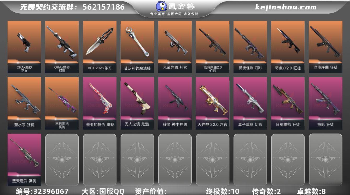 【Hww67】国服Q区 皮肤价值43230 【20橙皮 1金皮 6紫皮 皮肤85 28英雄 108卡面 1105已用源晶】 黄金 优质装备:2025全球冠军赛套装,2022全球冠军赛套装,RGX 11z Pro//2.0套装【套装】:2025全球冠军赛套装,2022全球冠军赛套装,RGX 11z Pro//2.0套装 【英雄】:幻棱,炼狱,维斯,暮蝶,钛狐,壹决,铁臂,捷风,雷兹,幽影,不死鸟,贤者,猎枭,蝰蛇,零,芮娜,奇乐,尚勃勒,霓虹,斯凯,夜露,星礈,K/O,海神,盖可,黑梦,钢锁 【近战武器】:近战武器-2025全球冠军赛 蝴蝶刀,近战武器-2022全球冠军赛 蝴蝶刀,近战武器-RGX 11z Pro//2.0 蝴蝶刀,近战武器-离子武器//2.0 爪刀,近战武器-诡秘蛇影 军刀,近战武器-神圣领域 战刀,近战武器-阿特拉斯指挥部 甩棍,近战武器-星际猎兵 短剑 【狂徒】:狂徒-艾沃莉的梦之翼,狂徒-2025全球冠军赛,狂徒-混沌序曲,狂徒-噬影者,狂徒-多弥尔的复仇,狂徒-盖亚的复仇,狂徒-耀鳞威龙,狂徒-紫阙金琅,狂徒-诡秘蛇影 【幻影】:幻影-2022全球冠军赛,幻影-RGX 11z Pro//2.0,幻影-混沌序曲//2.0,幻影-神圣领域,幻影-末日之翼 【戍卫】:戍卫-盖亚的复仇,戍卫-月球哨兵,戍卫-折光棱晶 【獠犬】:獠犬-神圣领域 【冥驹】:冥驹-RGX 11z Pro//2.0,冥驹-堕天遗武,冥驹-星云暗涌 【飞将】:飞将-塑水宗,飞将-末日之翼 【莽侠】:莽侠-诡秘蛇影,莽侠-月球哨兵 【战神】:战神-神圣领域 【奥丁】:奥丁-末日之翼 【判官】:判官-诡秘蛇影 【雄鹿】:雄鹿-月球哨兵 【骇灵】:骇灵-RGX 11z Pro//2.0,骇灵-无限竞技,骇灵-星云暗涌 【蜂刺】:蜂刺-星云暗涌,蜂刺-折光棱晶 【标配】:标配-RGX 11z Pro//2.0,标配-折光棱晶 【正义】:正义-奇点,正义-月球哨兵 【鬼魅】:鬼魅-盖亚的复仇,鬼魅-诡秘蛇影,鬼魅-扑棱扑棱,鬼魅-星云暗涌 【狂怒】:狂怒-神...