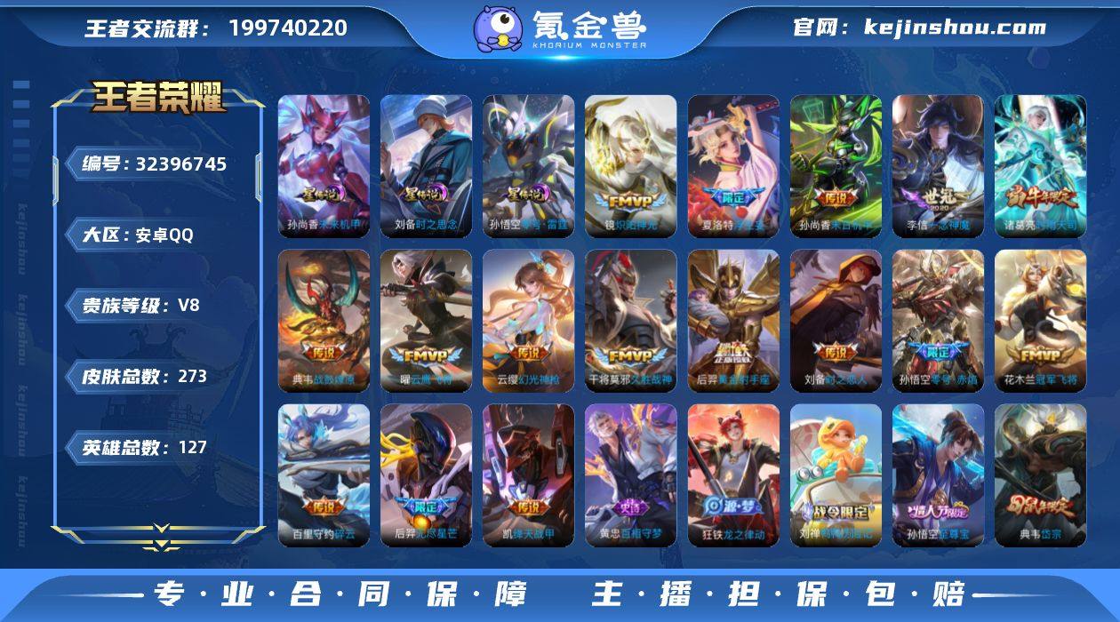 【店铺主推·霜北刀·浮生妄·时雨天司·幻光神枪·一念神魔·冠军飞将·至尊宝·共赏芳华天幕】【可二次】w18101-安卓Q-127英雄-273皮肤-8王者印记-150铭文-贵族积分5w【贵族8】【3星传说·20传说·1天幕·13按键·263幸运值】【因赛季更新游戏段付以上号为准!】 【英雄全皮】:孙权全皮,敖隐全皮,戈娅全皮,空空儿全皮,影全皮 【星元皮肤】:刘备时之思念,孙悟空零号雷霆,孙尚香未来机甲 【天幕】:共赏芳华天幕 【传说皮肤】:云缨幻光神枪,桑启鸣野蒿,夏侯惇霜北刀,典韦战鼓燎原,夏洛特浮生妄,孙悟空齐天大圣,百里守约碎云,后羿无尽星芒,诸葛亮时雨天司,铠绛天战甲,镜炽阳神光,虞姬启明星使,孙悟空零号赤焰,曜云鹰飞将,李信一念神魔,刘备时之恋人,干将莫邪久胜战神,花木兰冠军飞将,后羿黄金射手座,孙尚香末日机甲 【限定皮肤】:夏侯惇霜北刀,蔡文姬夏日便利店,大乔绒语心约,虞姬夏日便利店,姜子牙天穹之誓,李白谪仙醉月,狄仁杰阴阳师,赵云皇家上将,赵云引擎之心,孙尚香蔷薇恋人,鲁班七号狮舞东方,扁鹊奇幻香踪,吕布猎兽之王,元歌无心,典韦蓝屏警告,典韦岱宗,马可波罗山海玄木吟,狄仁杰魔术师,狄仁杰万华元夜,达摩沙漠行僧,项羽海滩派对...