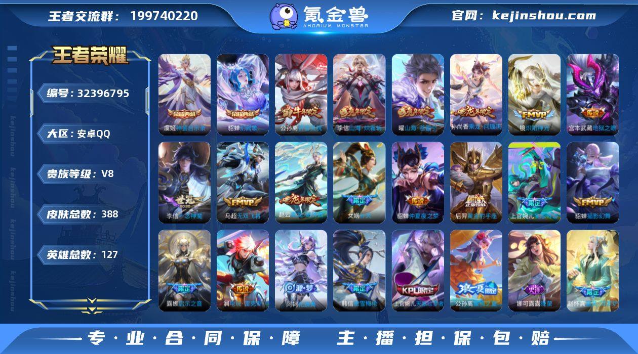 [17662901]V8 3典藏 22传说 127英雄 388皮肤 可修改实名 女号 【英雄全皮】上官婉儿全皮,孙权全皮,蚩奼全皮,戈娅全皮,影全皮,大禹全皮 【稀有英雄】敖隐(小龙人),大司命,韩信(韩跳跳),夏洛特(夏师傅),艾琳,橘右京(橘子),娜可露露(鸟人),不知火舞,赵云,金蝉(唐僧),戈娅 【荣耀水晶】神鉴启示录,九霄神辉(木兰典藏),幻阙歌(貂蝉典藏) 【传说皮】神骥·越千峰,乘龙·铭钟鼎(赵云年限),乘龙·问璇玑(孙尚香年限),山海·炽霜斩(李信年限),黄金射手座,仲夏夜之梦(大飞蛾),地狱之眼,一念神魔,猫影幻舞,炽阳神光,无双飞将,山海·苍雷引(电光曜子),电玩·雷克斯,妄想奇谈 【珍宝阁皮】妄想食味,胡桃夹子,蔷薇恋人,玩趣恶龙 【赛季/战令皮】噬灭天穹(s37),古海寻踪(s33),星界游侠,海盐诗旅(s30),擒涛扼浪(s31),潮玩骑兵,奇幻香踪,探海日志(s32),驭风魔法,玲珑珍味,流音漫舞,顽趣-梦奇,地狱燃心,剑破天穹(s35),天穹祈灯(s34),青焰无极,苍威无极,天穹之誓(s36),蔡文姬夏日便利店,虞姬夏日便利店,暖冬·兔眠,御霄(s14),御旌(s15),御銮(s16),朔风刀(s17),混沌棋(s18),疑决卦(s19),醍醐杖(s20),原初探秘者(s21),万华元夜(s22),演武夺筹(s23),驱傩正仪(s24),千军破阵(s25),猎兽之王,朔望之晖,蓝屏警...