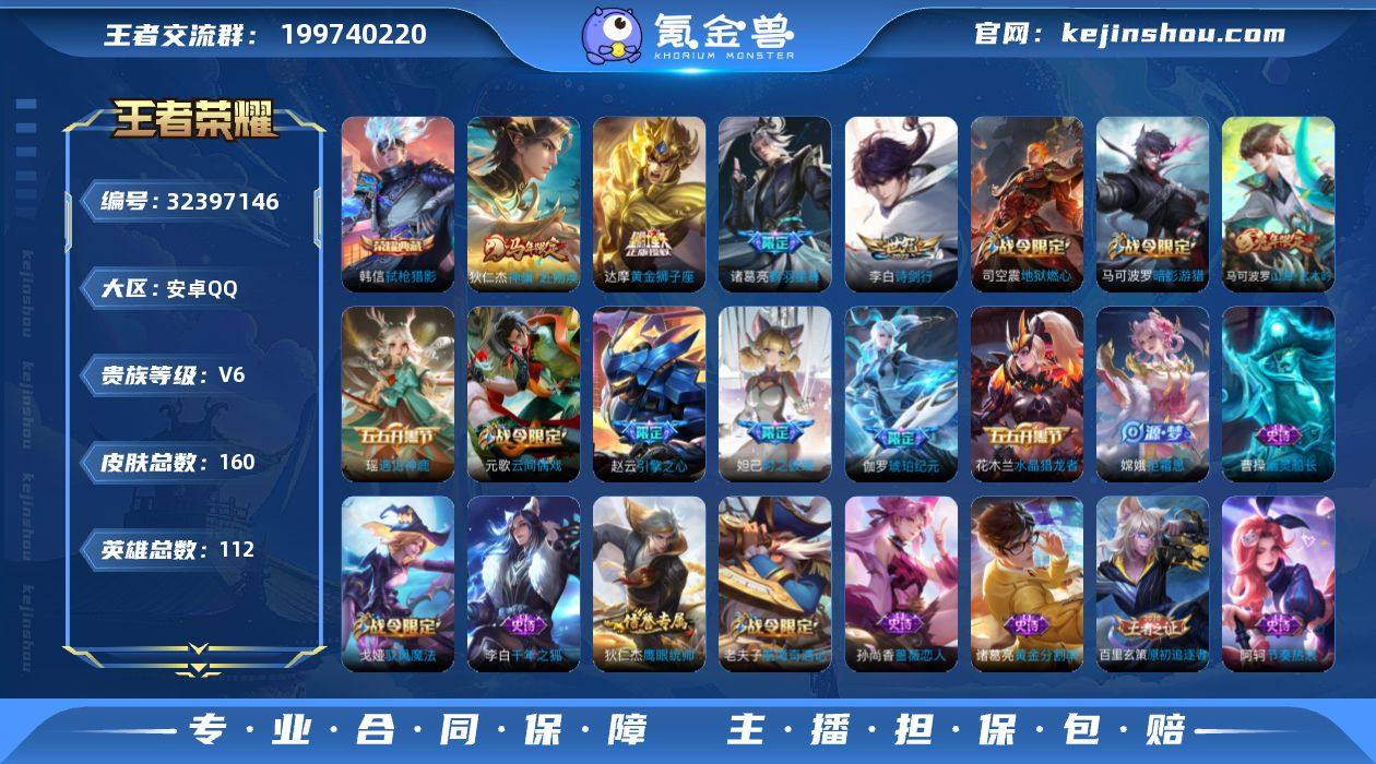 【XY150】贵族7/皮肤221/传说9/史诗55/英雄125/神树通天/幻光神枪/鸣野蒿/末日机甲-孙策/淬星耀世/零号·赤焰/武圣/凤求凰/地狱火/天穹之誓(s36)/阴阳师/皇家上将/龙胆/神迹守卫-墨子/蔷薇恋人/狮舞东方/乒乒小将/高山流水/白晶晶/幻夜卜梦/云间偶戏/朔风刀(s17)/魔术师/万华元夜(s22)/星际陆战队-达摩/海滩派对/醍醐杖(s20)/航海奇遇记/冰锋战神/演武夺筹(s23)/一生所爱/逐梦之影/傲雪梅枪/潮玩骑士王/美猴王/至尊宝/大圣娶亲/银河之约/云中旅人(s29)/神迹守卫-钟馗/驱傩正仪(s24)/遇见飞天/单词大作战/繁星吟游/原初探秘者(s21)/五谷丰年/混沌棋(s18)/星空之诺/疑决卦(s19)/李小龙/擒涛扼浪(s31)/御狮(s13)/御霄(s14)/胡桃异想国/纤云弄巧/御銮(s16)/狂想玩偶喵/探海日志(s32)/匿光追影者/海盐诗旅(s30)/江河有灵/古海寻踪(s33)/鬼谷子天穹祈灯(S34)/妄想食味/剑破天穹(s35)/熔金海岸/圣诞恋歌/偶像歌手/鬼剑武藏/水果甜心/摇滚巨星/魅力维加斯/龙骑士/金属风暴/圣诞狂欢/幽灵船长/末日机甲-吕布/乱世虎臣/乘风破浪/暗隐猎兽者/心灵骇客/曙光守护者/天才门将/逐浪之夏/功夫厨神/星夜王子/节奏热浪/鹰眼统帅/晚萤/热力回旋/天秀·启明/化蝶舞/百相守梦-黄忠/涂山容容/教廷特使/街头霸王/哥特玫瑰/致命风华/爱心护理/大发明家/白执事/忍·炎影/白色死神/化身博士/天使之翼/时尚教父/少女阿狸/黄金武士/死亡骑士/拳王/兔女郎/花好人间/万事如意/万象初新/阿尔法小队/纽约教父/汉昭烈帝/黑猫爱糖果/龙腾万里/海滩丽影/霸王丸/幻想奇妙夜/功夫老勺/沉稳之力/掌控之力/敏锐之力/幻乐之宴/坚韧之力/守护之力/科学大爆炸/虹云星官/奇妙博物学/丁香结/神迹守卫/鲨炮海盗猫/炽热元素使/次元突破/黑桃队长/圆桌骑士(盾山)/无尽征程/秘密基地/次元傲视/瓷语鉴心/缤纷绘卷/重装意志/乓乓大师/铁甲之心/潮玩牛仔/无双福将/幻泉...