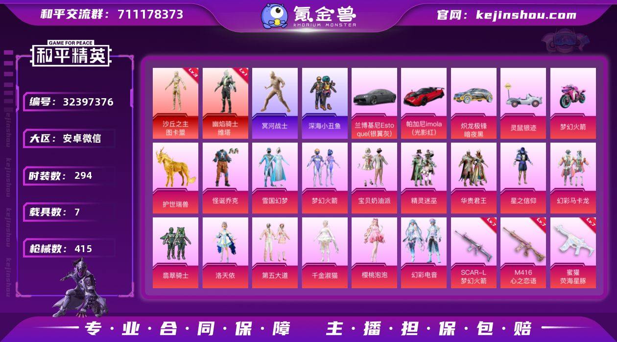 老木乃伊 安卓 微信-2神装-14粉装-20特效枪-7载具-15粉色飞行器-156200热力值-32王牌印记-294套装-415枪皮【红色神装等级】:幽焰骑士-维塔(一级),沙丘之主-图卡盟(三级)【热门品类】:粉装-怪诞乔克,粉装-雪国幻梦,粉装-梦幻火箭,套装-冥河战士,套装-深海小丑鱼,套装-小丑鱼,套装-金羽特工,套装-龟仙人,套装-潮萌小黄鸭,套装-浪漫波比,角色-Mark.06【粉色套装】:粉装-怪诞乔克,粉装-宝贝奶油派,粉装-雪国幻梦,粉装-精灵迷巫,粉装-梦幻火箭,粉装-华贵君王,粉装-星之信仰,粉装-幻彩马卡龙,粉装-翡翠骑士,角色-洛天依,粉装-第五大道,角色-千金淑猫,角色-樱桃泡泡,粉装-幻彩电音【粉色枪皮等级】:AKM-绿萝繁花(五级),AKM-魔法神域(三级),AKM-幽焰骑士(六级),SCAR-L-梦幻火箭(七级),SCAR-L-金蛇镇世(一级),SCAR-L-灵驹仙姬(三级),M416-心之恋语(七级),GROZA-镜光银凌(五级),AUG-暖羊咩咩(五级),蜜獾-荧海星豚(七级),ACE32-萌骑漫游(四级),UMP45-量子极限(五级),AKS-74U-森灵之息(五级),P90-沙丘之主(三级),Kar98K-巳巳如意(五级),M24-星之信仰(七级),Mk14-福马献瑞(一级),DP-28-豹影疾电(五级),MG-36-沧焰双生(五级)【粉色载具】:兰...