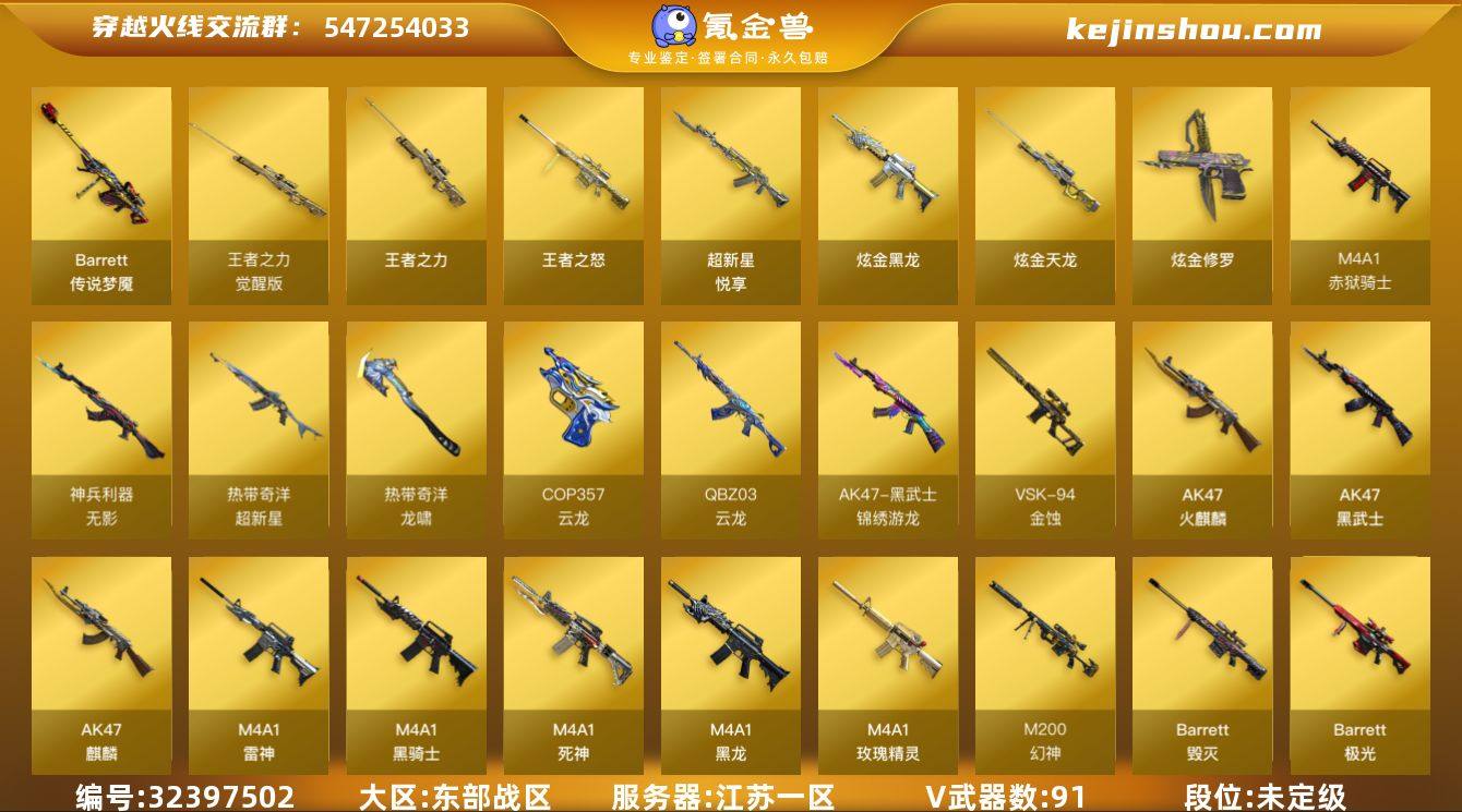 江苏一区-93V-4王者武器数-3炫金武器数 【传说武器】:传说梦魇 【热门武器】:传说梦魇,G36C-幻影,M200-幻神,死亡之眼,柯尔特-冠军之特,Cat-刀锋,M4A1-黑骑士,汤姆逊-烈龙*4,加特林-炼狱*4,5-炽火炎龙*2,沙鹰-修罗*4 【王者炫金武器】:超新星-悦享,王者之怒,王者之力,炫金黑龙,炫金天龙,炫金修罗 【音效卡】:M200-幻神音效卡,Barrett-毁灭音效卡,QBZ03-天罚音效卡 【皮肤】:幻神-宠儿-2021MVP,雷神-能量核心,雷神-宠儿-2019MVP,雷神-炽焰魔龙,雷神-宋雨琦 皮肤,火麒麟-雷神,毁灭-暗月*2,毁灭-AG-CFPLS15冠军,毁灭-风暴,黑龙-暗月,黑骑士-暗月,黑骑士-伏羲,天启-暗月,战神-流金岁月皮肤,天龙-秘银*2,天龙-能量核心,AWM-天龙-传奇70KG,AWM-天龙-传奇白鲨,天神-暗月*3 【角色】:瞳,电竞教官-云悠悠,隼,华,王者-魅影,雪域霜狐,奇洋探员,空,电竞少女,飞虎队-X,嘉年华灵狐,荆棘玫瑰,娟娟,兰-海滩派对,灵狐者-黄金海岸,麻雀,潘多拉-X,游珑儿 【人偶武器】:5-炽火炎龙*2,AWM-灵狐-15周年嘉年华,Cat-刀锋,迷你牛牛 【暴走生化】:异变清道夫,KAC-狂怒咆哮,双面神,死亡之眼 【挑战大师】:神圣爆裂者III 【英雄级武器...