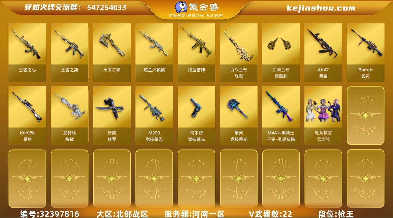 【ky6174】河南一区-26V-3王者武器数-2炫金武器数 【热门武器】:M200-竞技荣光,Kar98K-星神,加特林-炼狱,USP-雷暴,沙鹰-修罗*2 【王者炫金武器】:王者之势,王者之心,王者之啸,炫金火麒麟,炫金雷神 【音效卡】:炼狱-百战金芒-庆典舞曲音效卡 【皮肤】:M4A1-再燃火线,雷神-神秘按键 皮肤,毁灭-英雄计划 皮肤,M4A1-千变-孔明皮肤,轻型军用手斧-再燃火线 【角色】:电竞教官-云悠悠,葵-阿尔法武装,幻面灵狐,娟娟,灵狐者-职业经理,龙儿,潘多拉-X,潘多拉-甜心教官,雪莉杨-摸金校尉 【人偶武器】:AWM-灵狐-15周年嘉年华 【挑战大师】:AK47-冰龙粉碎者 【英雄级武器】:AK47-黑鲨,HK417-朱雀-电竞之星,Barrett-毁灭,Kar98K-星神,M200-竞技荣光,加特林-炼狱,炼狱-百战金芒,沙鹰-修罗*2,USP-雷暴,柯尔特-竞技荣光,擎天-竞技荣光,麒麟刺-百战金芒,高爆手雷-竞技荣光,闪光弹-竞技荣光,烟雾弹-竞技荣光 【道具】:亚洲杯纪念炫彩背包,百战金芒炫彩背包,女皇终结者-魔龙之吻,救世主-黑桃战神,绿色巨人,灵魂忍者,迷雾幽灵,夺命之镰,防化服*2,流光-鎏金之域,语音特效-盛典烟火,萌萌小葵表情,防弹头盔*5,防弹衣*5,C4工具钳*5,手雷包*5...