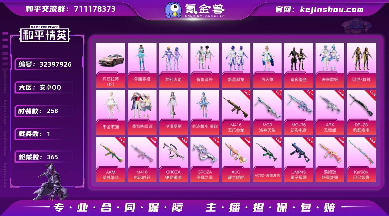 可二次 【特价出售/店主推荐】 安卓 手Q-12粉装-22特效枪-1载具-10粉色飞行器-12.2w热力值-18王牌印记-258套装-365枪皮【热门品类】:粉装-梦幻火箭,套装-浪漫天命,套装-小丑鱼,套装-金羽特工,套装-龟仙人,套装-暗影哥特,套装-粉红小猪,角色-Mark.06【粉色套装】:粉装-梦幻火箭,粉装-智能音符,粉装-新星烈龙,角色-洛天依,粉装-暗夜鎏金,粉装-未来歌姬,套装-创世·救赎,角色-千金淑猫,粉装-星穹咏叹调,角色-冷漠罗丽,角色-奇迹舞步 美琪,角色-异瞳寒姬【粉色枪皮等级】:AKM-绿萝繁花(五级),AKM-幻海仙踪(四级),M416-五爪金龙(七级),M416-电玩时刻(五级),GROZA-镜光银凌(五级),GROZA-圣辉之星(五级),AUG-暖羊咩咩(五级),M762-青锋波束(五级),ACE32-萌骑漫游(二级),ARX-无垠阁(六级),UMP45-量子极限(五级),汤姆逊-热量炸弹(五级),AKS-74U-森灵之息(五级),P90-沙丘之主(三级),Kar98K-巳巳如意(五级),Mk14-甜梦熊击(五级),Mk14-福马献瑞(五级),DP-28-豹影疾电(五级),MG3-洛神天依(七级),MG-36-幻彩电音(七级)【粉色载具】:玛莎拉蒂Ghibli(粉)【粉色飞行器】:炫彩糖果飞行器,祥瑞起舞飞行器,黄族统领飞行器,镜域双华-灵镜之阶,幻海精...