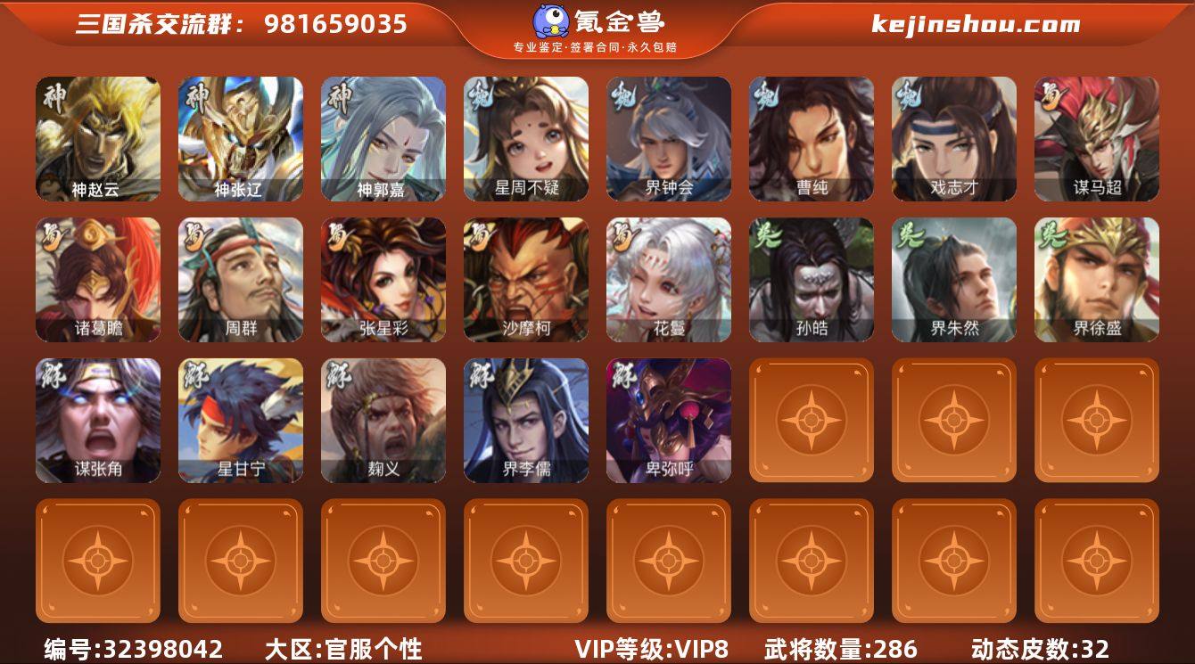 【289】官阶:骠骑将军;VIP等级:VIP8;史诗武将数量:23;动态皮肤数量:32;武将总数:286;史诗宝珠数量:26;将魂数量:0;神将:4;魏国史诗武将:18;蜀国史诗武将:6;吴国史诗武将:3;群史诗武将:6