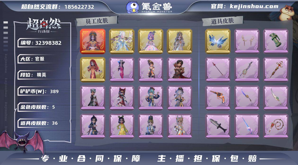 粉皮1;金皮5;紫皮7;道具皮25;皮肤:小黄-炽天使,薇薇安-圣光之谕,逍遥-莲华渡,巫铃儿-镜花辞,小黄-遗失的童话,莉莉-瑶台梦,小黄-呱呱雨衣,阿念-庆宴绮愿,爱丽丝-丝缕哀歌,薇薇安-白光莹,逍遥-绣春逍影,零-青云逸歌,爱丽丝-耀眼的你;道具:腰包-惊魂娃娃,传送按钮-幻宠之门,刺刀-小鲨匕首,专业手电-花束般的告白,长鞭-小狗蛇点点鞭,音响-鸣沙鼓,葫芦-伏妖塔,专业手电-云端梦想计划,桃木剑-凤鸣九天,长枪-波塞冬,音响-happy猫,黄牛能量饮料-青玉抱丹,刺刀-碧络琅环,闪光弹-金戈玄铜,夜视仪-金丝眼镜,腰包-月下莲台,摸金符-花落精绝,额外的背包-飞花令,转轮手枪-新星时代,黄牛能量饮料-珍珠芭乐莓莓,铲子-赞萌波板糖,急救包-蔷薇物语,传送按钮-昆仑镜,铲子-龙鳞,喷气背包-乘风溯雪;美妆:美妆-萌兔气泡,美妆-暗夜小恶魔;饰品:头饰-惊魂南瓜头套,头饰-烈焰红唇头套,头饰-嘻嘻头套,头饰-火爆了头套,头饰-小狗蛇点点头套,头饰-呆滞头套,头饰-大葱明头套,头饰-烛光纪念,头饰-蒜了八,头饰-面具马头套,头饰-卑微头套,头饰-炙热烧烤,头饰-樱桃奶油布丁,头饰-萨卡班甲鱼头套,头饰-哈士奇头套,头饰-滑稽头套,头饰-鱼头怪头套,头饰-饺饺者头套,头饰-像素朋克墨镜,头饰-后室幸存者头套,挂饰-九色祥鹿,挂饰-钗头凤,挂饰-未竟乐园,挂饰-孤独对望,挂饰-小鲨包包,挂饰-天使消失的年代,背饰-牛啤背包,背饰-蝶恋花,背饰-云梦之星,背饰-醉花阴;主页装扮:主页装扮-虚镜回廊;动作:动作-luvaboy,动作-新年摇,动作-企鹅舞,动作-萨克斯律动舞,动作-鹏友摇,动作-知世摇,动作-小雨摇,动作-心跳摇,动作-舞台中心,动作-要糖,动作-举牌,动作-抬手,动作-KT猫摇;工牌背景:工牌背景-珊瑚海,工牌背景-卷珠帘,工牌背景-雷霆轩,工牌背景-圣光之誓,工牌背景-粉嫩小海狸,工牌背景-童话扉页,工牌背景-蓝海奇遇,工牌背景-点点萌伴,工牌背景-流...