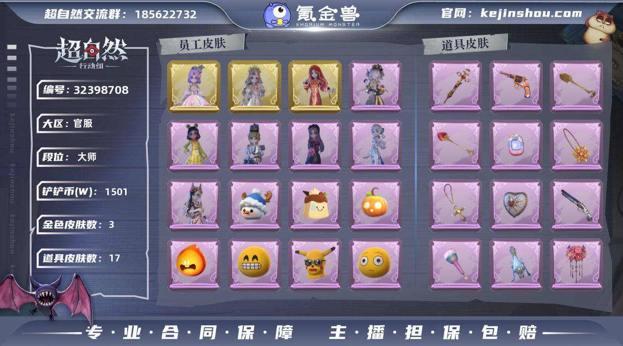 金皮3;紫皮6;道具皮17;皮肤:巫铃儿-镜花辞,小黄-遗失的童话,薇薇安-圣光之谕,爱丽丝-丝缕哀歌,巫铃儿-素影瑶光,莉莉-除妖小师妹,薇薇安-白光莹,阿念-王子与骑士,小黄-呱呱雨衣;道具:急救包-蔷薇物语,专业手电-云端梦想计划,转轮手枪-新星时代,摸金符-祝祷词,黄牛能量饮料-青玉抱丹,夜视仪-金丝眼镜,摸金符-花落精绝,短管猎枪-星光的裁决,音响-鸣沙鼓,喷气背包-乘风溯雪,传送按钮-幻宠之门,腰包-宝剑八,急救包-末章心跳,额外的背包-飞花令,铲子-圣心之泪,音响-happy猫,铲子-龙鳞;饰品:头饰-呆滞头套,头饰-卑微头套,头饰-嘻嘻头套,头饰-炙热烧烤,头饰-樱桃奶油布丁,头饰-滑稽头套,头饰-鱼头怪头套,头饰-面具马头套,头饰-惊魂南瓜头套,头饰-火爆了头套,头饰-烈焰红唇头套,头饰-萨卡班甲鱼头套,头饰-哈士奇头套,头饰-雪墩墩头套,头饰-大葱明头套,头饰-像素朋克墨镜,头饰-后室幸存者头套,挂饰-未竟乐园,挂饰-九色祥鹿,挂饰-钗头凤,挂饰-天使消失的年代,背饰-蝶恋花,背饰-天使的呼唤;动作:动作-小雨摇,动作-舞台中心,动作-心跳摇,动作-鹏友摇,动作-luvaboy,动作-举牌,动作-律动迪斯科,动作-抬手,动作-要糖;工牌背景:工牌背景-卷珠帘,工牌背景-童话扉页,工牌背景-冰晶宫,...