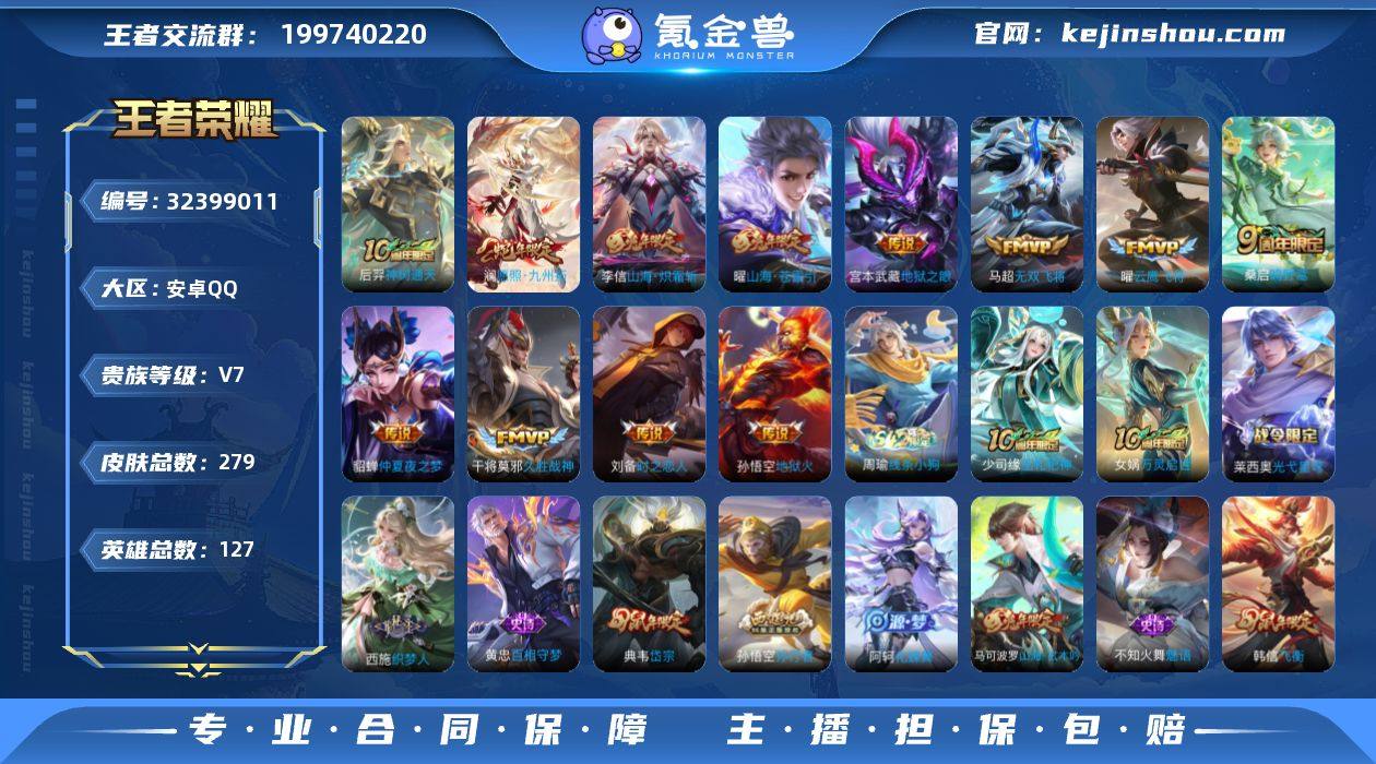安卓Q-V8-尊贵铂金I段位-127英雄-171皮肤-2典藏皮肤-1典藏英雄-6传说-28史诗【荣耀典藏】:武则天英雄,孙悟空全息碎影,鲁班七号星空梦想【传说皮肤】:桑启鸣野蒿,虞姬启明星使,貂蝉猫影幻舞,花木兰冠军飞将,貂蝉仲夏夜之梦,武则天海洋之心【限定皮肤】:白起狰,狄仁杰阴阳师,赵云皇家上将,嬴政白昼王子,孙尚香蔷薇恋人,芈月重明,吕布猎兽之王,夏侯惇朔风刀,曹操烛龙,曹操天狼征服者,典韦穷奇,狄仁杰魔术师,狄仁杰万华元夜,项羽海滩派对,老夫子醍醐杖,关羽冰锋战神,程咬金演武夺筹,韩信逐梦之影,孙悟空美猴王,孙悟空至尊宝,孙悟空大圣娶亲,牛魔御旌,李元芳云中旅人,虞姬启明星使,钟馗驱傩正仪,杨玉环遇见飞天,蔡文姬繁星吟游,太乙真人饕餮,鬼谷子原初探秘者,弈星混沌棋,明世隐疑决卦,裴擒虎李小龙,狂铁御狮,米莱狄御霄,盾山御銮,上官婉儿梁祝,鲁班大师探海日志,桑启海盐诗旅,张良古海寻踪,鬼谷子天穹祈灯,刘邦剑破天穹【年限皮肤】:孙悟空美猴王【赛季限定】:白起狰,太乙真人饕餮,曹操烛龙,芈月重明,典韦穷奇,狂铁御狮,米莱狄御霄,牛魔御旌,盾山御銮,夏侯惇朔风刀,弈星混沌棋,明世隐疑决卦,老夫子醍醐杖,鬼谷...