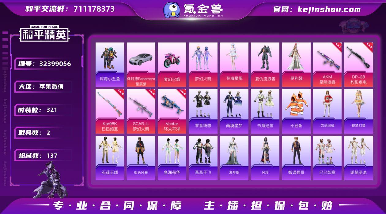 【特价出售】苹果V-2载具4粉装5特效枪6热门90套装137枪皮 44083热力值 6印记 历史传奇王牌16星 【2载具】 保时捷Panamera(星辰紫) 双人摩托梦幻火箭 【4粉装】 梦幻火箭 萨利娅 荧海星豚 复仇流浪者 【5特效枪】 SCAR-L-梦幻火箭 (4级) Kar98K-巳巳如意 (5级) DP-28-豹影疾电 (5级) AKM-星际浪客 (7级) Vector-环太平洋 (4级) 【6热门】 小丑鱼 龟仙人 深海小丑鱼 军刀雅典娜 英勇保护者 M24-奇异狩猎者 【2飞行器】 梦幻火箭飞行器 千面幻镜飞行器 【1头盔】 梦幻火箭头盔 【1背包】 梦幻火箭背包