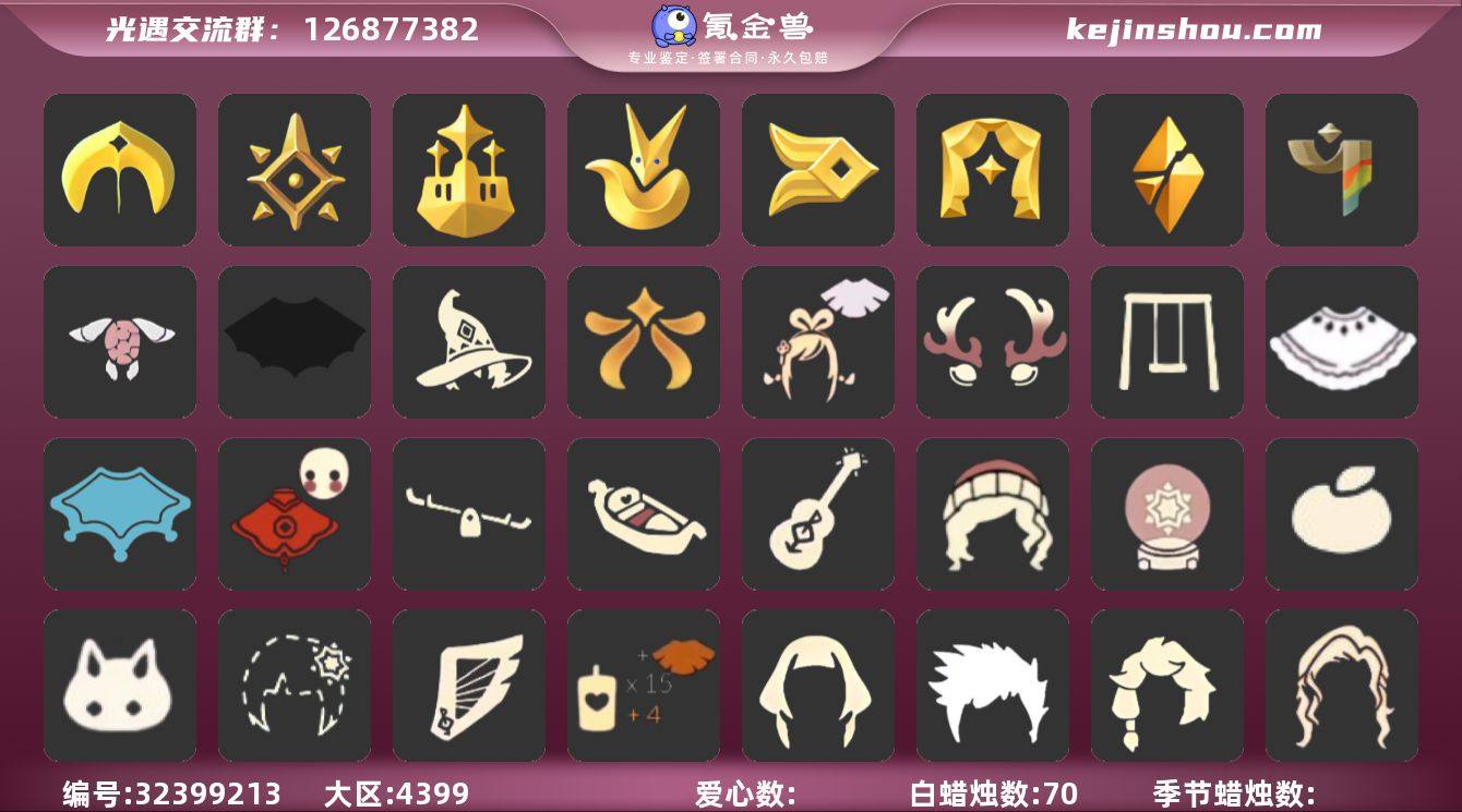 [17592946]安卓官服 手机账号 4珍稀物品 8毕业季 6毕业图 70蜡烛 【珍稀物品】白枭(帝企鹅发),阿努比斯(狗头),玫瑰花,鳐鲲斗篷 【季节已毕业】圣岛季,预言季,梦想季,小王子季(王子季),风行季,表演季,破晓季,彩染季 【完成地图】晨岛,云野,雨林,霞谷,墓土(暮土),禁阁 【礼包】青衫落拓礼包,姆明饰品套装(姆明尾巴),彩虹帽(多彩绒帽),南瓜(冥龙南瓜),巫师(巫师帽),绊爱(绊爱斗篷)(绊爱礼包),橘子(大橘大利),雪花(雪花发夹),兔子(玉兔头饰)(玉兔发饰)(兔子发饰),鹿角(圣诞鹿角),创始人(创始人斗篷),欧若拉之翼,福娃(福娃礼包)(春之日礼包)(铜钱斗),海龟斗篷,蝙蝠套(蝙蝠斗篷)(南瓜头),瑞雪(瑞雪斗篷)(暖冬瑞雪),白绒金(白雪斗篷),竖琴(雏鸟之琴),吉他(音韵吉他)(白吉他),秋千(情人秋千),跷跷板(情人跷跷板),小船(情人小船),雪花球(雪花水晶球) 【裤子】王子服(小王子套装),武士裤,背带裤,搓澡巾,击剑裤 【面具】黄眉企鹅面具,辉光羚羊面具,贴花面具(丛林黑面具),阿努比斯,凤凰面具 【面饰】青鸟毕业面饰(青鸟面饰),红耳机 【发型】小王子发型,单侧绑发(单边小辫),留辫蘑菇头,虚荣,若笠(箬笠) 【头饰】平顶帽,蓝色音乐会(蓝色音乐符),行军锅头盔(六边锅帽子)(双耳锅帽子),羽毛发...