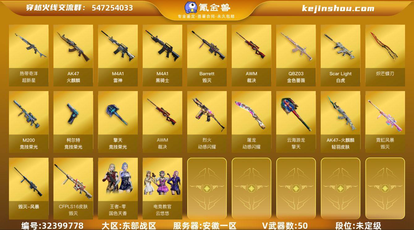 安徽一区-54V-0王者武器数-0炫金武器数 【热门武器】:QBZ03-金色蔷薇,Scar Light-白虎,M200-竞技荣光,QBZ03-街机,Cat-刀锋,M4A1-黑骑士,COP-白鲨,炽芒蝶刃 【音效卡】:M4A1-黑骑士音效卡,Barrett-碧霄极光音效卡,炼狱-百战金芒-庆典舞曲音效卡,死神-雪域霜狐-怀旧音效卡 【皮肤】:裁决-运输船 皮肤,雷神-云海游龙皮肤,雷神-源计划2.0专属 皮肤,M4A1-再燃火线,火麒麟-轻羽皮肤,火麒麟-百城,毁灭-SV-CFPLS16冠军,毁灭-风暴,毁灭-英雄计划 皮肤 【角色】:电竞教官-云悠悠,战地猎狐,王者-瞳-闭月羞花,王者-零-国色天香,雪域霜狐,奇洋探员,乔伊教练,修道士,云海玲珑,暗夜-X,飞虎队-X,嘉年华灵狐,娟娟,兰妹妹,曼陀罗-X,斯沃特-X,游珑儿 【人偶武器】:COP-白鲨,Cat-刀锋,迷你深渊冰龙,迷你裂空之翼*2,迷你波特博士,夺魂,迷你火种,生化手雷-机甲核心,深渊终结者手雷,迷你巨石泰坦-魔花研究所 【暴走生化】:超级对讲机 【挑战大师】:神圣爆裂者III*2,冰龙粉碎者-白马银枪,VEPR-12-金魔*2,激光毁灭者III*2,机甲撕裂者III,神圣爆裂者-末日III,阐释者III*2 【英雄级武器】:AK47-火麒麟*2,M4A1-雷神*2,M4A1-黑骑士,Scar Light...