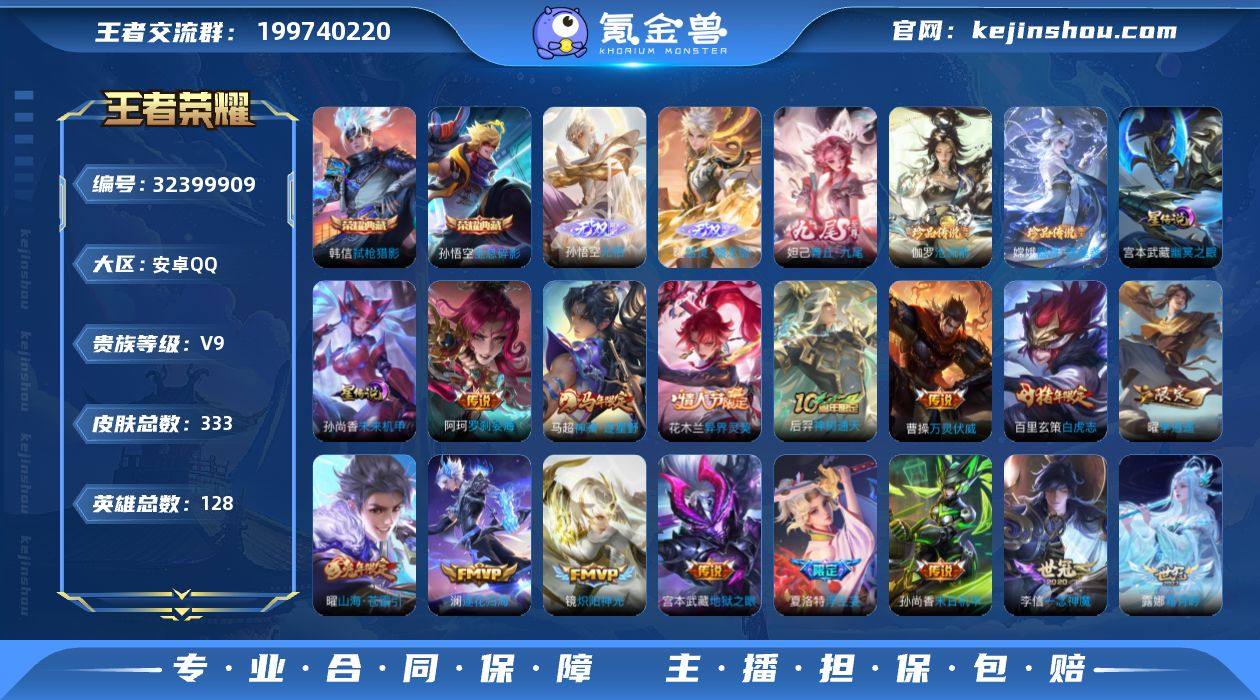 无二次-安卓Q-V9-最强王者段位-128英雄-340皮肤-2典藏皮肤-5无双-2珍品传说-32传说-93史诗 【英雄全皮】:孙权全皮,盾山全皮 【荣耀典藏】:孙尚香杀手不太冷,铠银白咏叹调 【无双皮肤】:李信问心剑,孙悟空无相,曜器灵螭龙剑,公孙离离恨烟,李白碎月剑心 【珍品传说】:伽罗沧流箭,嫦娥器灵落星盏 【传说皮肤】:云缨神骥越千峰,狄仁杰神骥赴朔漠,马超神骥逐星野,杨戬纵目迁山,后羿神树通天,云缨幻光神枪,桑启鸣野蒿,夏侯惇霜北刀,孙尚香乘龙问璇玑,赵云乘龙铭钟鼎,澜逐花归海,宫本武藏惊梅引,东皇太一灼幽烈阳,孙悟空齐天大圣,吕布怒海麟威,马超无双飞将,孙策挚爱之约,赵云淬星耀世,王昭君乞巧织情,李元芳飞鸢探春,铠绛天战甲,虞姬启明星使,曜云鹰飞将,干将莫邪久胜战神,达摩黄金狮子座,百里玄策白虎志,花木兰冠军飞将,后羿黄金射手座,杨戬永曜之星,李白凤求凰,孙尚香末日机甲,宫本武藏地狱之眼 【限定皮肤】:白起狰,公孙离离恨烟,夏侯惇霜北刀,暃埋骨钱,狄仁杰阴阳师,虞姬凯尔特女王,赵云皇家上将,赵云龙胆,妲己热情桑巴,妲己时之彼端,嬴政白昼王子,鲁班七号狮舞东方,庄周蜃楼王,庄周高山流水,高渐离死亡摇滚,高渐离玩趣恶龙,钟无艳王者之锤,孙膑妖精王,扁鹊炼金王,芈月重明,吕布猎兽之王,周瑜赤莲之焰,元歌无心,夏侯惇朔风刀,甄姬游园惊梦,曹操烛龙,典韦穷奇,典韦蓝屏警告,狄仁杰魔术师,狄仁杰万华元夜,达摩沙漠行僧,项羽海滩派对,老夫子醍醐杖,关羽冰锋战神,程咬金演武夺筹,兰陵王驯魔猎人,兰陵王金庭之子,花木兰默契交锋,亚瑟狮心王,孙悟空孙行者,孙悟空齐天大圣,牛魔御旌,后羿辉光之辰,后羿如梦令,后羿圣弓游侠,李元芳银河之约,李元芳云中旅人,虞姬启明星使,钟馗神迹守卫,钟馗驱傩正仪,杨戬永曜之星,杨戬潮玩骑...