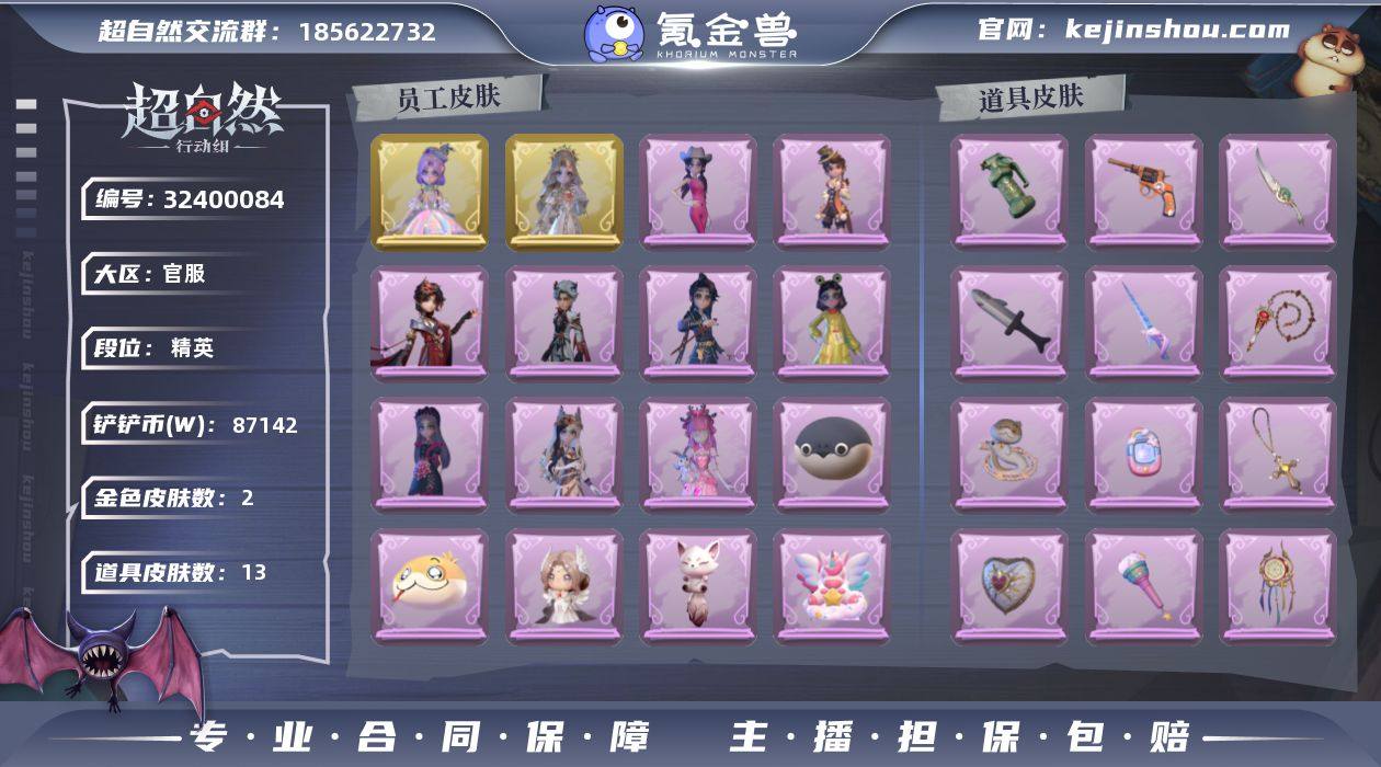 粉皮1;紫皮7;道具皮26;皮肤:小黄-炽天使,小黄-异色序曲,薇薇安-黑月挽歌,阿念-庆宴绮愿,小黄-呱呱雨衣,艾伦-黎明猎手,爱丽丝-耀眼的你,爱丽丝-丝缕哀歌;道具:刺刀-铂刺与红萼,喷气背包-乘风溯雪,急救包-蔷薇物语,摸金符-紫霄,转轮手枪-新星时代,腰包-宝剑八,桃木剑-永眠曲,腰包-红运福虎,铲子-龙鳞,摸金符-花落精绝,音响-鸣沙鼓,折扇-赴此良宵,短管猎枪-赞萌露比水枪,传送按钮-浮生一梦,摸金符-祝祷词,伞-沐春颂,专业手电-云端梦想计划,闪光弹-金戈玄铜,刺刀-赤色之刃,急救包-末章心跳,夜视仪-敛花容,长鞭-缚誓之锁,传送按钮-昆仑镜,长枪-波塞冬,音响-月光奏鸣曲,伞-伞;美妆:美妆-萌兔气泡;饰品:头饰-炙热烧烤,头饰-马上有钱,头饰-鱼头怪头套,头饰-惊魂南瓜头套,头饰-卑微头套,头饰-面具马头套,头饰-烈焰红唇头套,头饰-腊肠扭扭,头饰-嘻嘻头套,头饰-火爆了头套,头饰-萨卡班甲鱼头套,头饰-园丁鲨鲨头套,头饰-咬咬鲨头套,头饰-驼半仙头套,头饰-饺饺者头套,头饰-樱桃奶油布丁,头饰-雪墩墩头套,头饰-哈士奇头套,头饰-烛光纪念,头饰-太空鲨头套,头饰-呆滞头套,头饰-滑稽头套,头饰-蒜了八,头饰-精致露比头套,头饰-像素朋克墨镜,头饰-粽小宝头套,头饰-后室幸存者头套,挂饰-糖果守卫,挂饰-小小玛丽,挂饰-小鲨包包,挂饰-桂冠聆诗,挂饰-天使消失的年代,挂饰-孤独对望,挂饰-不朽的今夜,挂饰-钗头凤,挂饰-拂云仙,背饰-天使的呼唤,背饰-牛啤背包,背饰-侧耳倾听,背饰-白鼬趴趴,背饰-蝶恋花,背饰-在逃小新娘;动作:动作-舞台中心,动作-luvaboy,动作-鸳鸯戏,动作-新年摇,动作-金城舞,动作-卡点舞,动作-小雨摇,动作-心跳摇,动作-举牌,动作-抬手,动作-拜年,动作-要糖,动作-蝴蝶步,动作-山楂树之舞;工牌背景:工牌背景-卷珠帘,工牌背景-珊瑚海,工牌背景-童话扉页,工牌背景-圣光之誓,工牌背景-粉嫩小海狸,工牌背景-春和景...
