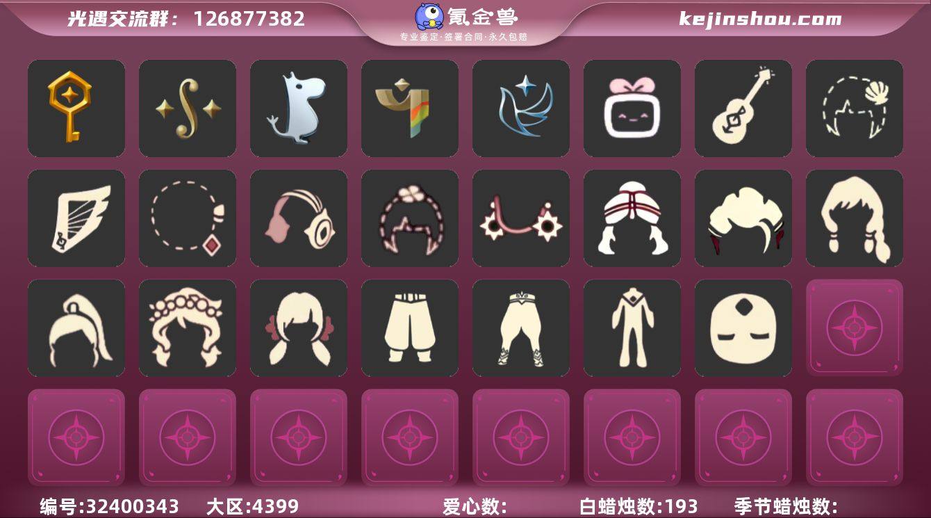 蜡烛数量:50 爱心数量:500 季节蜡烛数量:30 翼数量:0 姆明季,彩染季,青鸟季,双星季,迁徙季 双星季毕业斗篷,必胜客联动斗篷,青鸟毕业斗篷,姆明季·斗篷 丝滑短发,中分长发,迁徙鳐语者发型,迁徙钟匠发型,海牛发型,士兵发型,温柔的玩具匠发型,青鸟盛装彩纸发型,马蹄莲发型,紫色挑染半扎发型,彩染跳跃舞者发型,彩染拳礼武僧发型,海蓝波浪发型,郡主发型,健忘兔子发型,帽匠绅士发型,彩虹发型,歪啾啾发型,公主头,女生短发,咖喱,公主,蝴蝶结,正太,书虫,高马尾,粗辫,虚荣,若笠,樱花,猫耳 迁徙鸟语者裤子,迁徙水母者裤子,迁徙鳐语者裤子,巧手隐士长裙,士兵裤子,温柔的玩具匠长裙,严厉的牧牛人长裙,彩染拳礼武僧裤子,彩染挑衅艺伎裤子,彩染跳跃舞者裤子,海浪长裤,肯德基联动厨师装,浅彩系腰长袍,青鸟伐木不舍裤子,青鸟盛装彩纸连衣裙,青鸟尊贵蓬头裤子,蛇年裤子,妮妮裙子,透明裤子,双子裤,击剑裤 黑脸白眉面具,六芒星面具 迁徙钟匠眼镜,必胜客联动面饰,飘带耳坠,肯德基联动眼镜,青鸟占卜智慧面饰,青鸟毕业面饰,羽毛耳环,蒙眼面巾,彩虹耳坠,星星眼镜 迁徙水母者发饰,迁徙引蝶人触须,彩虹头巾,蝴蝶发饰 迁徙季节项链,优雅领结,双星季项链,必胜客联动围巾,青鸟毕业项链,彩染季项链 刀疤士兵鞋子,青鸟伐木不舍鞋子,寻宝长靴,彩染挑衅艺伎鞋子,彩染跳跃舞者鞋子,肯德基联动皮鞋,人字拖,姆明季·鞋子,芭蕾鞋 活力海牛礼包,小海牛配饰礼包,小黄鸭发饰礼包,小黄鸭雨衣套装礼包,缤纷飘带斗篷礼包,必胜客联动分享披萨背饰礼包,必胜客联动装扮礼包,青衫落拓礼包,心心相印发饰礼包,粽子发饰礼包,立式钢琴礼包,彩虹武士裤,巫师,荷叶伞,牛仔裤,兔子鞋,彩虹耳钉,彩虹耳机 卖家说:有的东西分不清名字可以手拉手验号看