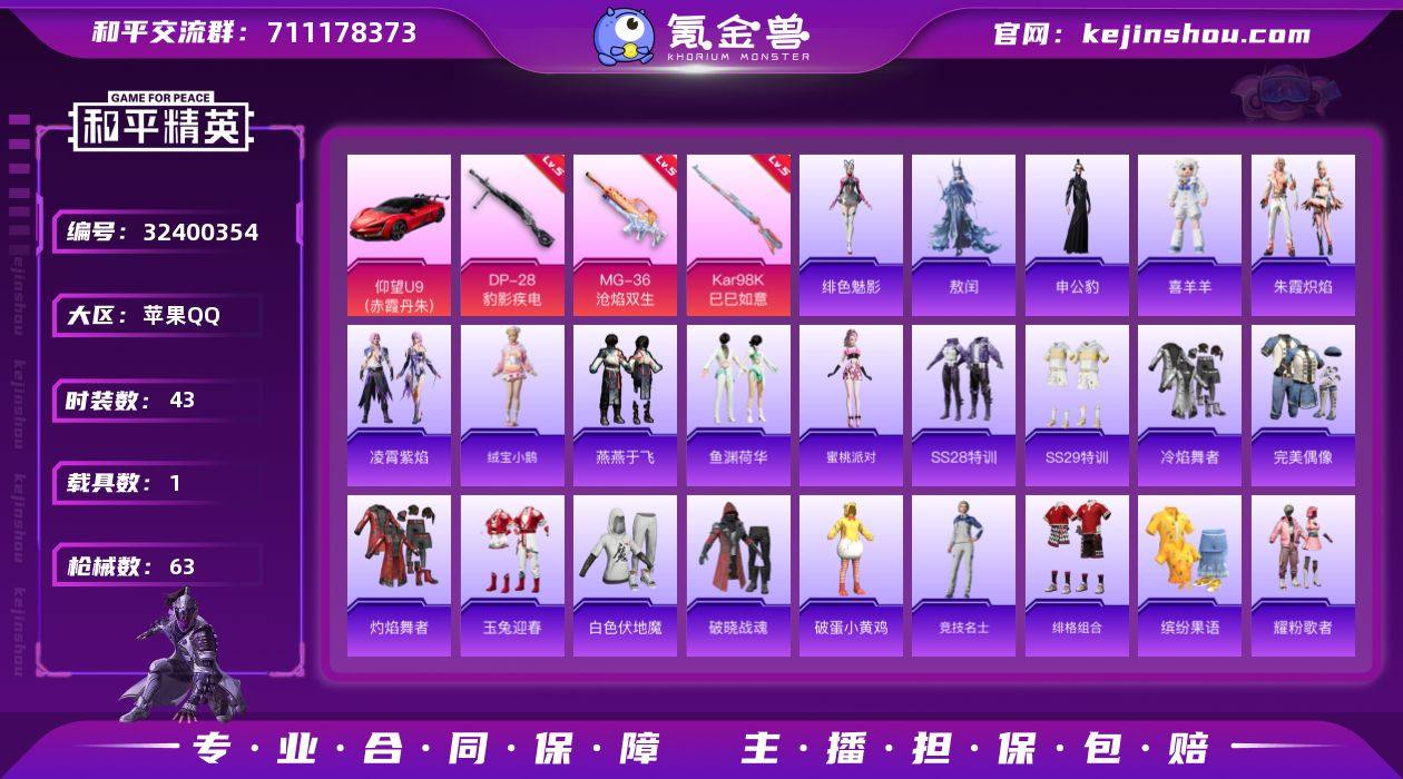 【店主推荐捡漏号!可直接换绑】苹果 手Q-0粉装-3特效枪-1载具-1粉色飞行器-17973热力值-2王牌印记-43套装-63枪皮【粉色枪皮等级】:Kar98K-巳巳如意(五级),DP-28-豹影疾电(五级),MG-36-沧焰双生(五级)【粉色载具】:仰望U9(赤霞丹朱)【粉色枪皮】:Kar98K-巳巳如意,DP-28-豹影疾电,MG-36-沧焰双生【粉色飞行器】:灵珠游龙飞行器