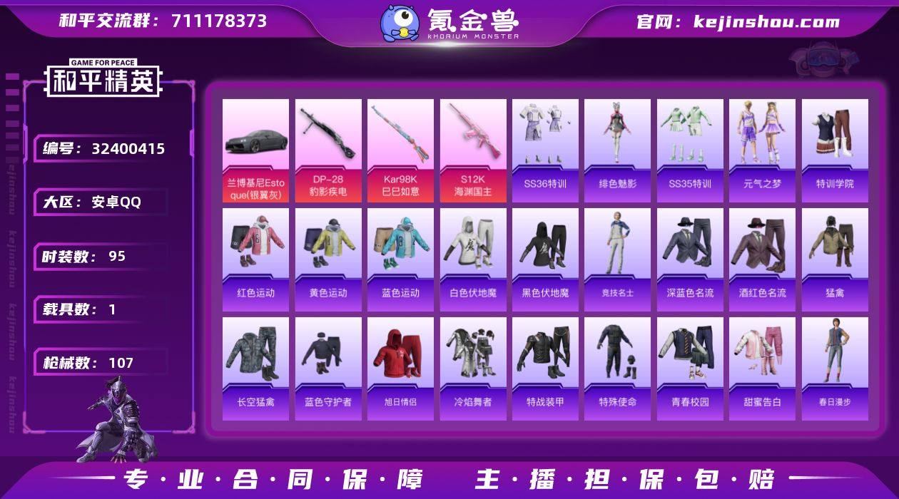 安卓 手Q-2粉装-5特效枪-0载具-0粉色飞行器-47275热力值-6王牌印记-132套装-163枪皮 【热门品类】:套装-浪漫天命,套装-小丑鱼,角色-军刀雅典娜 【粉色套装】:角色-圣堂之誓,粉装-星穹咏叹调 【粉色枪皮等级】:AKM-绿萝繁花(五级),SCAR-L-锦绣绵绵(五级),AKS-74U-星穹咏叹调(七级),Kar98K-巳巳如意(五级),DP-28-豹影疾电(五级) 【粉色枪皮】:AKM-绿萝繁花,SCAR-L-锦绣绵绵,AKS-74U-星穹咏叹调,Kar98K-巳巳如意,DP-28-豹影疾电 【粉色降落伞】:至尊龙雀降落伞,未来歌姬降落伞,闲梦青缨降落伞,圣堂之誓降落伞,千金淑猫降落伞,星穹咏叹调降落伞 【稀有套装】:套装-巳巳如意,角色-摩登魅猫,套装-燕燕于飞,套装-鱼渊荷华,角色-蜜桃派对,套装-粉恋花,套装-紫幽梦,套装-蓝冰羽,套装-彩虹兔,套装-云朵鹅,套装-雪绒豹,套装-朱霞炽焰,套装-凌霄紫焰,玩偶服-懒羊羊,角色-绯色魅影 【稀有枪皮】:AKM-彩虹符号,AKM-环太平洋,AKM-缤纷海域,AKM-霓虹街区,AKM-龙的传人,M16A4-幻世战舞者,SCAR-L-玉兔迎春,SCAR-L-红色方程式,M416-暗夜行者,M416-糯团青竹,M416-蓝色火焰,GROZA-影袭,GROZA-恐龙拽拽,GROZA-田园牧歌,AUG-耀粉歌者,AUG-月影灵韵,QBZ-彩虹符号,QBZ-飞驰魅影,M762-天降萌叽,M762-云朵鹅,Mk47-妙红点点,AC-VAL-天降萌叽,AC-VAL-快闪甜心,蜜獾-天降萌叽,蜜獾-娇憨猪猪,蜜獾-绯穹魔姬,ARX-凌霄紫焰,UZI-啾咪啾咪,UZI-娇憨猪猪,UZI-影袭,UMP45-涂山之恋,UMP45-生命誓言,UMP45-蓝色火焰,Vector-焰鹰斗篷,Vector-生命誓言,Vector-田园牧歌,Vector-创世·救赎,汤姆逊-天降萌叽,汤姆逊-炫彩节奏,汤姆逊-耀粉歌者,JS9-凌霄紫焰,P90-快闪甜心,P90-飞驰魅影,Kar98K-六号树人,Kar98K-彩虹符号,Kar98K-炫彩节奏,Kar98K-飞驰魅影,M24-影袭,M24-歌...