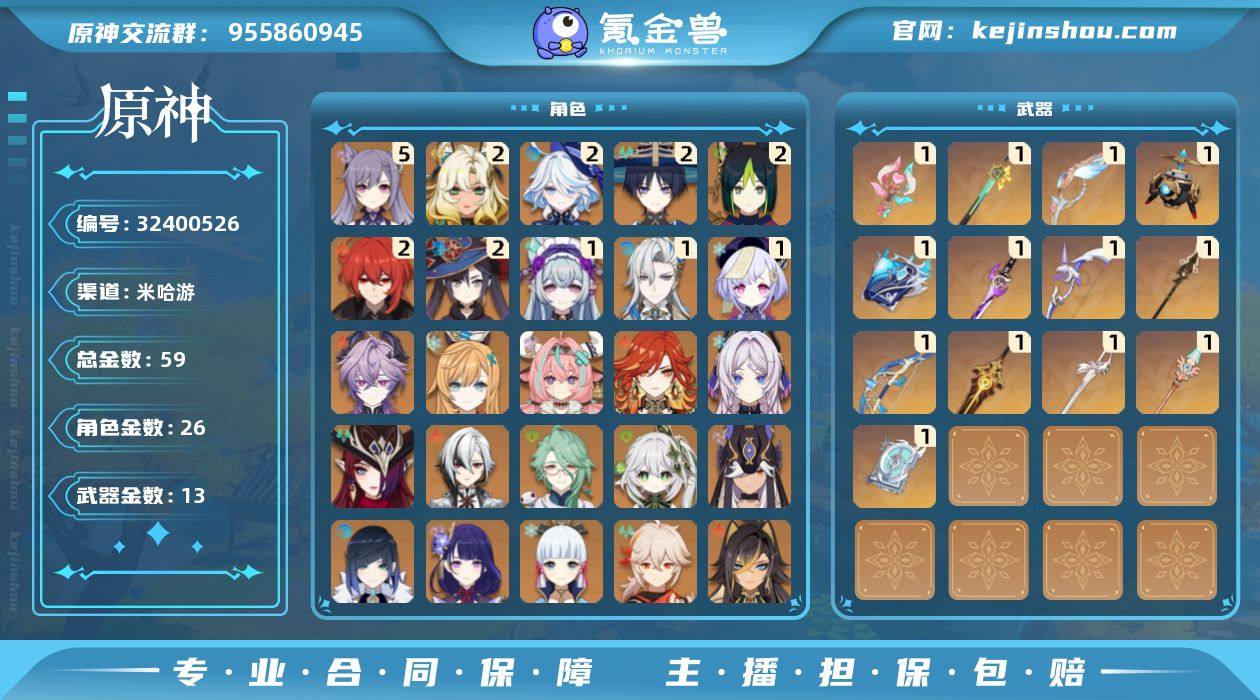 邮箱: 送网易邮箱 总黄数: 59 冒险等级: 60 5命金色角色: 五命刻晴 2命金色角色: 二命迪卢克,二命莫娜,二命提纳里,二命流浪者,二命芙宁娜,二命希诺宁 1命金色角色: 一命七七,一命那维莱特,一命梦见月瑞希 0命金色角色: 枫原万叶,神里绫华,琴,雷电将军,夜兰,赛诺,纳西妲,迪希雅,白术,阿蕾奇诺,恰斯卡,玛薇卡,茜特菈莉,瓦雷莎,爱可菲,杜林 拥有武器: 雾切之回光,四风原典,阿莫斯之弓,风鹰剑,贯虹之槊,天空之脊,终末嗟叹之诗,苇海信标,万世流涌大典,金流监督,白雨心弦,岩峰巡歌,溢彩心念 1精武器: 雾切之回光,四风原典,阿莫斯之弓,风鹰剑,贯虹之槊,天空之脊,终末嗟叹之诗,苇海信标,万世流涌大典,金流监督,白雨心弦,岩峰巡歌,溢彩心念 亮点: 【sy6】59黄26人2命希诺宁1命龙王 瓦蕾莎带专武2命水神等1958360级/59黄/女主/26个五星角色/13个五星武器0命阿蕾奇诺,2命芙宁娜,1命那维莱特,0命白术,0命迪希雅,2命流浪者,0命纳西妲,0命赛诺,2命提纳里,0命夜兰,0命雷电将军,0命枫原万叶,0命神里绫华,5命刻晴,1命七七,0命琴,2命莫娜,2命迪卢克,2命希诺宁,0命恰斯卡,0命玛薇卡,0命茜特菈莉,1命梦见月瑞希,0命瓦雷莎,0命爱可菲,0命杜林,精1白雨心弦,精1金流监督,精1万世流涌大典,精1苇海信标,...