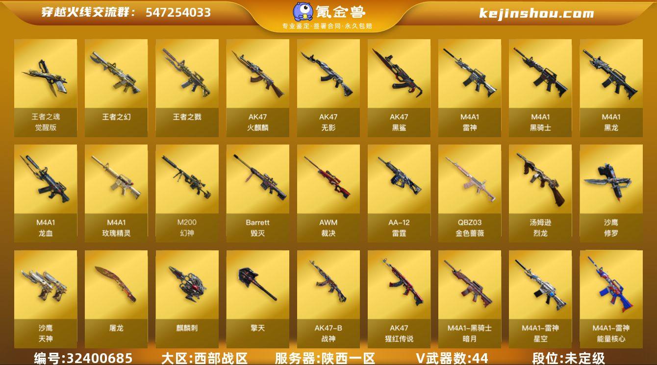 陕西一区-46V-3王者武器数-1炫金武器数 【热门武器】:QBZ03-金色蔷薇,M200-幻神,死亡之眼,M4A1-黑骑士,汤姆逊-烈龙,加特林-炼狱,沙鹰-修罗*3 【王者炫金武器】:王者之戮,王者之幻,炫金武士 【音效卡】:M4A1-雷神音效卡,M4A1-黑骑士音效卡,Barrett-毁灭音效卡 【皮肤】:雷神-暗月,雷神-能量核心,雷神-星空,火麒麟-心动糖果,毁灭耀金皮肤,黑龙-暗月,黑骑士-暗月,无影-能量核心,AK47-黑武士-361,战神-粉色甜心皮肤*2,战神-紫绶金章皮肤*5,战神-流金岁月皮肤 【角色】:葵,空,芳心审判者,风暴女,嘉年华灵狐,零-水下丽影,曼陀罗-X,潘多拉-X,斯沃特-X,兔囡囡,新娜塔莎 【人偶武器】:AWM-灵狐-15周年嘉年华,闪光弹-小乔 【暴走生化】:死亡之眼 【挑战大师】:冰龙粉碎者-白马银枪,激光毁灭者III 【英雄级武器】:AK47-火麒麟*2,M4A1-黑龙,M4A1-雷神*2,M4A1-黑骑士,AK47-无影,AK47-黑鲨,M4A1-龙血,SCAR Light-玄豹,M4A1-玫瑰精灵,QBZ03-金色蔷薇,AK-47-猩红传说*8,AK47-B-战神,Barrett-毁灭,AWM-裁决,M200-幻神,Barrett-金色蔷薇*2,加特林-炼狱,汤姆逊-烈龙,AA-12-雷霆,沙鹰-修罗*3,沙鹰-天神,王者之魂-觉醒版,屠龙*2,...