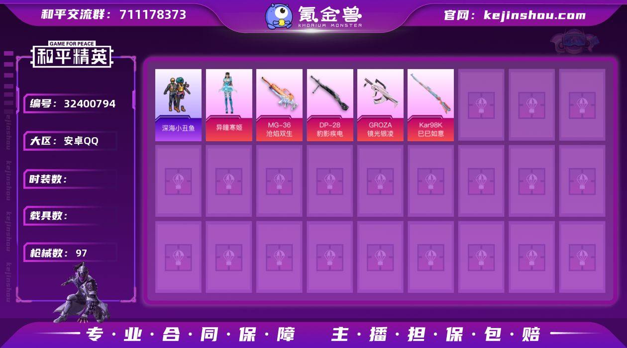 【0载具 4特效枪 1粉装 97枪皮 75套装】螳螂 深海小丑鱼 小丑鱼 申公豹 浪漫天命 卖崽青蛙 套装-浪漫天命,套装-深海小丑鱼,套装-小丑鱼,套装-老实芭蕉,角色-Mark.06,角色-异瞳寒姬 GROZA-镜光银凌,Kar98K-巳巳如意,MG-36-沧焰双生,DP-28-豹影疾电 鸡智如我飞行器,编号:ZPHTK60