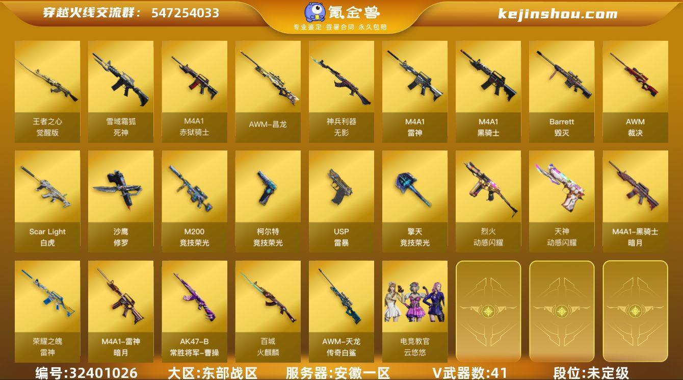 安徽一区-46V-4王者武器数-0炫金武器数 【热门武器】:Scar Light-白虎,M200-竞技荣光,M4A1-黑骑士,USP-雷暴,沙鹰-修罗 【音效卡】:M4A1-黑骑士音效卡,沙鹰-修罗-盛典舞曲音效卡*2,Barrett-碧霄极光音效卡,麒麟刺-百战金芒-盛典舞曲音效卡,炼狱-百战金芒-庆典舞曲音效卡,死神-雪域霜狐-怀旧音效卡 【皮肤】:雷神-暗月,雷神-荣耀之魄,M4A1-再燃火线,火麒麟-百城,AK47-火麒麟-百城23冠军皮肤,黑骑士-暗月,AK47-B-常胜将军-曹操,AWM-天龙-传奇白鲨,轻型军用手斧-再燃火线 【角色】:电竞教官-云悠悠,战地猎狐,雪域霜狐,乔伊教练,暗夜-X,初恋灵狐,风暴女,嘉年华灵狐,灵狐者-X,龙儿-小淘气,曼陀罗-X,潘多拉-X,潘多拉-甜心教官,斯沃特-X,蜀雪,雪莉杨-摸金校尉 【人偶武器】:AWM-灵狐-15周年嘉年华*2,迷你波特博士*2,生化手雷-机甲核心 【挑战大师】:冰龙粉碎者-白马银枪,激光毁灭者III-白马银枪*2,试炼破坏者III,神圣爆裂者-末日III 【英雄级武器】:M4A1-雷神,M4A1-黑骑士,Scar Light-白虎,无影-神兵利器,死神-雪域霜狐,烈火-动感闪耀,王者之心-觉醒版,Barrett-毁灭,AWM-裁决,M200-竞技荣光,王者星神-觉醒版,炼狱-百战金芒,...