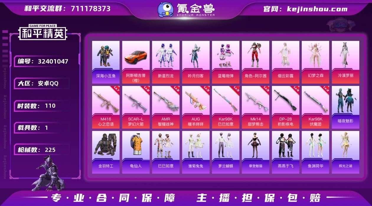 J2698 【精品号】7粉 8特 1载 深海小丑鱼 冷漠罗丽 幻梦之森 烟云彩霞 阿尔茜 蓝莓炮弹 满级枪*4 地铁满天赋 收藏家等级64 安卓 手Q-7粉装-8特效枪-1载具-2粉色飞行器-64550热力值-5王牌印记-110套装-225枪皮 【热门品类】:套装-深海小丑鱼,套装-金羽特工,套装-龟仙人 【粉色套装】:粉装-新星烈龙,粉装-吟月归客,粉装-蓝莓炮弹,角色-阿尔茜,角色-烟云彩露,粉装-幻梦之森,角色-冷漠罗丽 【粉色枪皮等级】:SCAR-L-梦幻火箭(六级),M416-心之恋语(七级),AUG-暖羊咩咩(五级),Kar98K-伏魔团(三级),Kar98K-巳巳如意(五级),Mk14-甜梦熊击(五级),AMR-智耀战神(六级),DP-28-豹影疾电(四级) 【粉色载具】:阿斯顿马丁DBX(橙) 【粉色枪皮】:SCAR-L-梦幻火箭,M416-心之恋语,AUG-暖羊咩咩,Kar98K-伏魔团,Kar98K-巳巳如意,Mk14-甜梦熊击,AMR-智耀战神,DP-28-豹影疾电 【粉色飞行器】:炫彩糖果飞行器,梦幻火箭飞行器 【粉色降落伞】:繁花小夜曲降落伞,四圣焕新降落伞,诡面斩降落伞,夏日绵绵冰降落伞,银刃赛罗降落伞,香水柠檬降落伞,暗翼战神降落伞,圣堂之誓降落伞,千金淑猫降落伞,幻梦之森降落伞,智耀战神降落伞,最终圣卫者降落伞,冷漠罗丽降落伞...