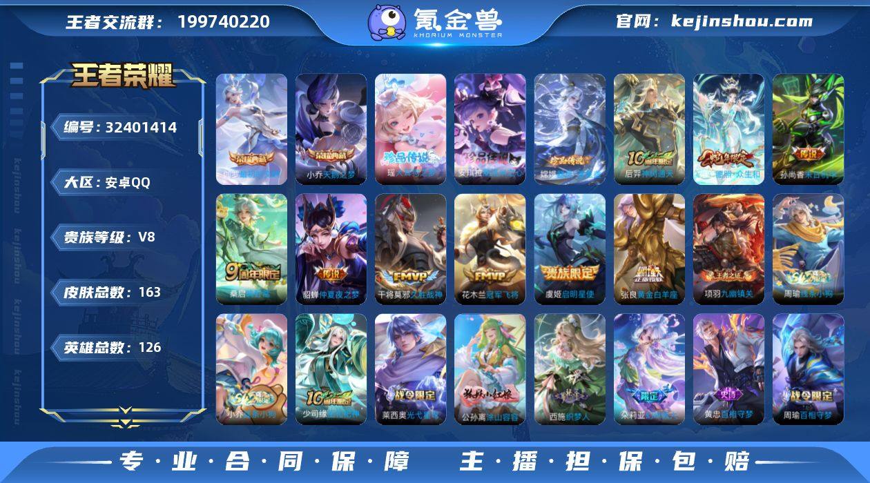 【漂亮女号貂蝉近万战伽罗小乔典藏安琪拉瑶嫦娥珍品11个高质量传说17个按键】安卓Q-V8-最强王者段位-126英雄-163皮肤-2典藏皮肤-3珍品传说-11传说-56史诗【英雄全皮】:影全皮【荣耀典藏】:小乔天鹅之梦,伽罗最初的交响【珍品传说】:安琪拉酷洛米之心,瑶大耳狗之梦,嫦娥器灵落星盏【传说皮肤】:朵莉亚神骥鸣幻洲,貂蝉神骥聚万邦,后羿神树通天,妲己愿照众生和,桑启鸣野蒿,虞姬启明星使,张良黄金白羊座,干将莫邪久胜战神,花木兰冠军飞将,貂蝉仲夏夜之梦,孙尚香末日机甲【限定皮肤】:狄仁杰阴阳师,赵云皇家上将,妲己时之彼端,孙尚香蔷薇恋人,狄仁杰魔术师,项羽海滩派对,老夫子醍醐杖,孙悟空至尊宝,虞姬启明星使,钟馗驱傩正仪,百里玄策原初追逐者,上官婉儿梁祝,西施玲珑珍味,艾琳女武神,艾琳流音漫舞,张良古海寻踪,妲己灵卜魔法,鬼谷子天穹祈灯,沈梦溪龙舞盛年,李元芳蔬乡物语,刘邦剑破天穹,程咬金群星魔术团,镜青焰无极【年限皮肤】:妲己愿照众生和【赛季限定】:老夫子醍醐杖,钟馗驱傩正仪,张良古海寻踪,鬼谷子天穹祈灯,刘邦剑破天穹,太乙真人谧流熔炉,钟馗虚灵犬护,甄姬逆浪荇歌,亚瑟荣光之誓,百里玄策原初追逐者,项羽九幽...