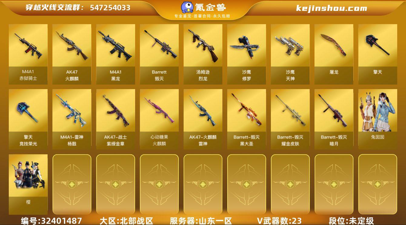 山东一区-28V-1王者武器数-0炫金武器数 【热门武器】:汤姆逊-烈龙,沙鹰-修罗*3 【皮肤】:雷神-杨戬,M4A1-再燃火线,火麒麟-雷神,火麒麟-心动糖果,毁灭-暗月,毁灭耀金皮肤,毁灭-黑大圣皮肤,战神-紫绶金章皮肤,轻型军用手斧-再燃火线 【角色】:樱,零·纪元,雪域霜狐,云海玲珑,葵-阿尔法武装,幻面灵狐,暗夜-X,初恋灵狐,芳心审判者,嘉年华灵狐,娟娟,灵狐者-X,曼陀罗-X,曼陀罗-礼服,潘多拉-X,青霞仙子,斯沃特-X,蜀雪,兔囡囡,樱-战斗天使 【人偶武器】:迷你深渊冰龙,夺魂,迷你超能女侍 【暴走生化】:超级对讲机 【挑战大师】:冰龙粉碎者-白马银枪,神圣爆裂者-末日III 【英雄级武器】:AK47-火麒麟,M4A1-黑龙,王者之魄-觉醒版,机械迷城-穹宇,Barrett-毁灭,汤姆逊-烈龙,沙鹰-修罗*3,沙鹰-天神*3,屠龙,擎天,擎天-竞技荣光,麒麟刺-百战金芒,高爆手雷-竞技荣光,闪光弹-竞技荣光,M4A1-赤狱骑士 【道具】:炫彩背包,百战金芒炫彩背包,雪域霜狐炫彩背包,女皇终结者-魔龙之吻,救世主-黑桃战神,绿色巨人,灵魂忍者*2,变异宝贝,迷雾幽灵*2,生化弹匣,夺命之镰*3,防化服*3,金色流光-枪王排位,语音特效-盛典烟火,语音特效-怀旧,雪...