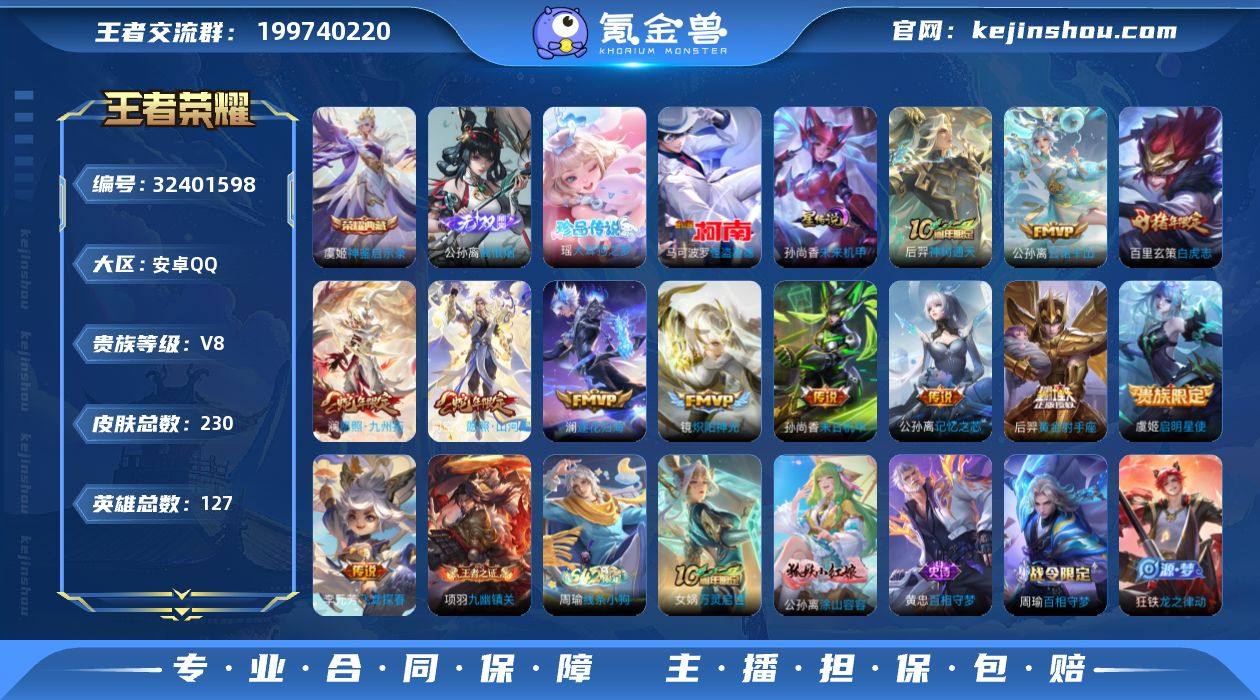 信用分不足实名: 可修改 贵族等级: V10 英雄数: 126 皮肤数: 416 荣耀水晶: 武则天,星空梦想,无限飓风号,活力突击,杀手不太冷,大秦宣太后,鸣剑·曳影,全息碎影,九霄神辉,银白咏叹调 星传说: 时之愿境,幻海之心,金色仲夏夜 传说皮: 黄金狮子座,黄金射手座,绛天战甲,黄金白羊座,久胜战神,炽阳神光,一念神魔,云霓雀翎,末日机甲-孙尚香,仲夏夜之梦,音你心动-小乔,零号·赤焰,海洋之心,地狱之眼,飞鸢探春,音你心动-周瑜,胖达荣荣,李逍遥,乞巧织情,时之恋人-刘备,游龙清影,淬星耀世,超时空战士-狄仁杰,遇见胡旋,末日机甲-孙策,花朝如约,挚爱之约,挚爱花嫁,无双飞将,碎云,艾琳觅芳踪 限定皮: 冰锋战神,遇见飞天,李小龙,游园惊梦,梁祝,云端筑梦师,龙胆,烈魂,魔法小厨娘,异界灵契,白晶晶,天魔缭乱,神威,蜜橘之夏,时之彼端,奇迹圣诞,太华,天狼征服者,逐梦之音,天狼运算者,逐梦之星,逐梦之影,神奇女侠,天狼绘梦者,凤求凰,寅虎·御盾,青龙志,玄武志,朱雀志,凤凰于飞,如梦令-嫦娥,至尊宝,真爱至上,武陵仙君,如梦令-后羿,寅虎·瑞焰,高山流水,孙行者,猪悟能,匿光追影者,女儿国国王,傲雪梅枪,寅虎·赤拳,寅虎·心曲,寅虎·展翼,时之祈愿-云中君,时之祈愿-瑶,玉兔公主,深海之息,唐三藏,五谷丰年,绯月行,神器·万象笔,降魔,怒海麟威,鸣野蒿