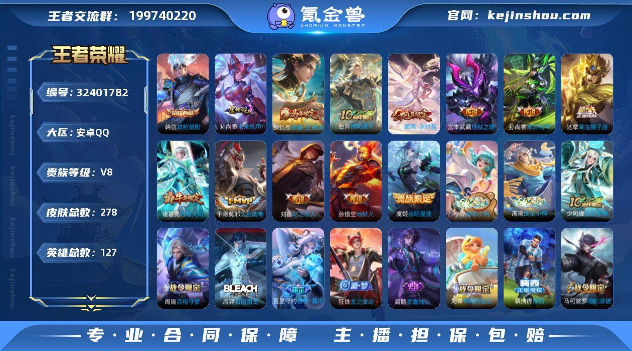 安卓Q-V5-至尊星耀III段位-126英雄-267皮肤-1典藏皮肤-10传说-67史诗【英雄全皮】:猪八戒全皮【荣耀典藏】:韩信弑枪猎影【传说皮肤】:后羿神树通天,云缨幻光神枪,桑启鸣野蒿,赵云淬星耀世,张良黄金白羊座,花木兰冠军飞将,后羿黄金射手座,宫本武藏地狱之眼,孙悟空地狱火,狄仁杰超时空战士【限定皮肤】:白起狰,姜子牙天穹之誓,狄仁杰阴阳师,赵云皇家上将,赵云引擎之心,孙尚香蔷薇恋人,庄周高山流水,高渐离玩趣恶龙,阿轲迷踪丽影,芈月重明,夏侯惇朔风刀,曹操烛龙,典韦穷奇,马可波罗暗影游猎,狄仁杰魔术师,狄仁杰万华元夜,达摩沙漠行僧,项羽海滩派对,老夫子醍醐杖,关羽冰锋战神,程咬金演武夺筹,刘邦夺宝奇兵,韩信飞衡,兰陵王金庭之子,孙悟空美猴王,孙悟空至尊宝,孙悟空大圣娶亲,孙悟空孙行者,牛魔御旌,后羿如梦令,后羿圣弓游侠,李元芳银河之约,李元芳云中旅人,钟馗驱傩正仪,杨玉环遇见飞天,干将莫邪真爱魔法,雅典娜黎明之约,蔡文姬繁星吟游,太乙真人饕餮,鬼谷子原初探秘者,鬼谷子五谷丰年,黄忠烈魂,铠青龙志,苏烈千军破阵,百里玄策原初追逐者,百里守约朱雀志,弈星混沌棋,梦奇顽趣,沈梦溪星空之诺,沈梦溪大漠名商,...
