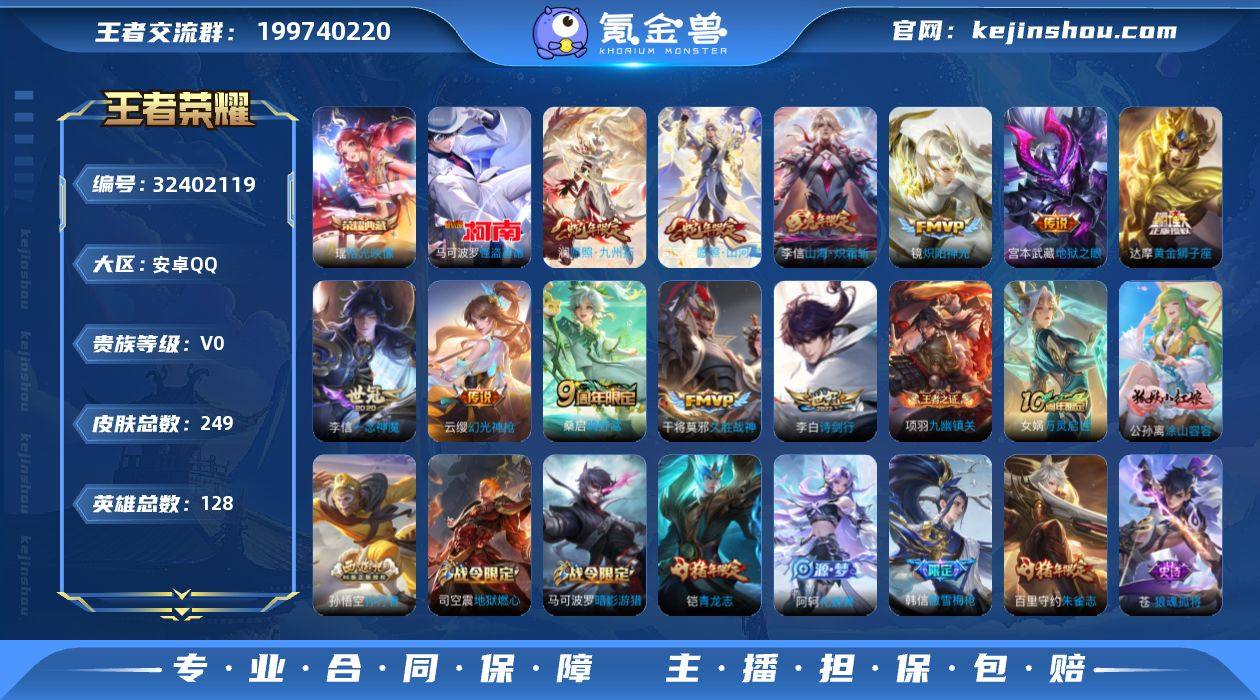 【特价出售】【永久包售后!!!】安卓Q-V8-至尊星耀IV段位-128英雄-214皮肤-1典藏皮肤-1无双-13传说-53史诗 【荣耀典藏】:鲁班七号星空梦想 【无双皮肤】:李白碎月剑心 【传说皮肤】:马超琥珀纪元,虞姬无限倾心,狄仁杰神器狴犴令,百里守约碎云,娜可露露前尘镜,马超无双飞将,曜李逍遥 ,虞姬启明星使,干将莫邪久胜战神,后羿黄金射手座,孙尚香末日机甲,孙悟空地狱火,狄仁杰超时空战士 【限定皮肤】:狄仁杰阴阳师,赵云皇家上将,墨子神迹守卫,嬴政白昼王子,孙尚香蔷薇恋人,鲁班七号狮舞东方,高渐离死亡摇滚,芈月重明,吕布猎兽之王,周瑜赤莲之焰,元歌云间偶戏,夏侯惇朔风刀,曹操烛龙,典韦穷奇,典韦蓝屏警告,马可波罗逐梦之星,马可波罗暗影游猎,马可波罗山海玄木吟,狄仁杰魔术师,狄仁杰万华元夜,狄仁杰神器狴犴令,达摩沙漠行僧,项羽海滩派对,老夫子醍醐杖,老夫子航海奇遇记,关羽冰锋战神,程咬金演武夺筹,兰陵王驯魔猎人,兰陵王金庭之子,娜可露露前尘镜,亚瑟潮玩骑士王,孙悟空大圣娶亲,牛魔御旌,李元芳银河之约,李元芳云中旅人,虞姬启明星使,虞姬无限倾心,钟馗神迹守卫,钟馗驱傩正仪,杨玉环遇见飞天,女娲朔望之晖,雅典娜黎...