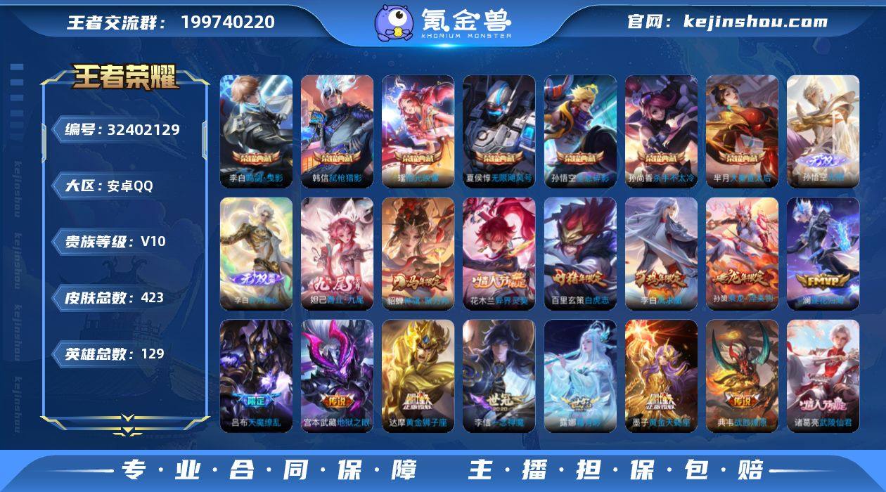 王者19752,不可二次,雪境奇遇天幕,安卓Q-V10-永恒钻石I段位-129英雄-423皮肤-7典藏皮肤-1典藏英雄-3无双-39传说-126史诗 【英雄全皮】:孙权全皮,钟馗全皮,苏烈全皮,敖隐全皮,空空儿全皮,影全皮 【荣耀典藏】:武则天英雄,孙悟空全息碎影,夏侯惇无限飓风号,孙尚香杀手不太冷,芈月大秦宣太后,李白鸣剑曳影,韩信弑枪猎影,瑶拾光映像 【无双皮肤】:孙悟空无相,李白碎月剑心,妲己青丘九尾 【传说皮肤】:貂蝉神骥聚万邦,花木兰异界灵契,桑启鸣野蒿,墨子黄金天蝎座,典韦战鼓燎原,孙策乘龙淬吴钩,澜逐花归海,艾琳觅芳踪,露娜霜月吟,兰陵王影龙天霄,吕布遇见神鼓,百里守约碎云,孙尚香异界灵契,赵云淬星耀世,王昭君乞巧织情,西施游龙清影,小乔音你心动,铠绛天战甲,虞姬启明星使,孙悟空零号赤焰,关羽武圣,曜云鹰飞将,李信一念神魔,刘备时之恋人,张良黄金白羊座,干将莫邪久胜战神,虞姬云霓雀翎,达摩黄金狮子座,百里玄策白虎志,花木兰冠军飞将,后羿黄金射手座,诸葛亮武陵仙君,貂蝉仲夏夜之梦,李白凤求凰,宫本武藏地狱之眼,孙悟空地狱火,吕布天魔缭乱,武则天海洋之心,狄仁杰超时空战士 【限定皮肤】:白起狰,姜子牙天穹之誓,李...