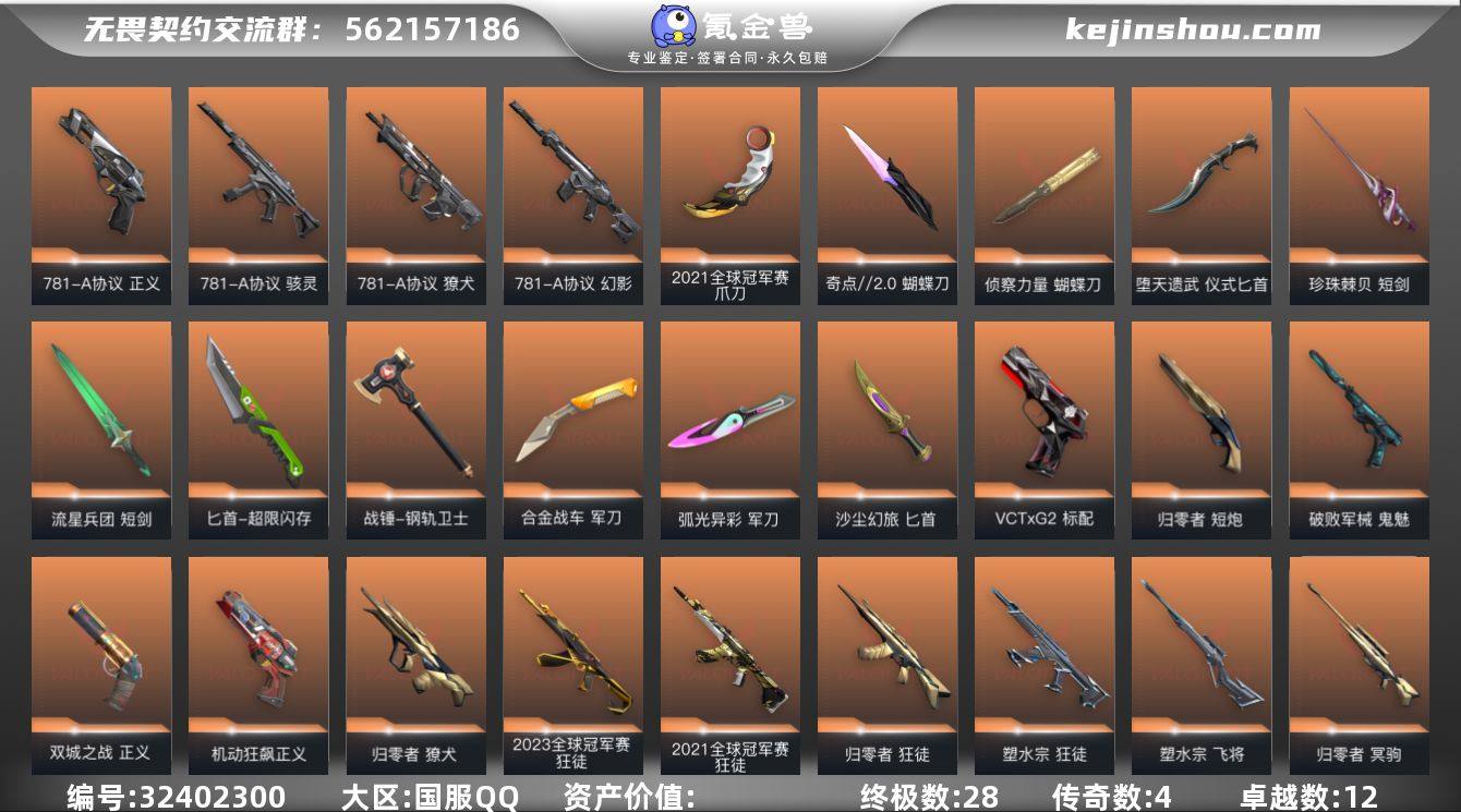 【自带包赔 可赔三倍】:库存价值222950 限定22 25 VCT爪刀 22W大库存极品号 英雄联盟900多左右皮肤 性价比超值 【限定】: 2025全球冠军赛 狂徒, 2025全球冠军赛 蝴蝶刀, 2022全球冠军赛 幻影, 2022全球冠军赛 蝴蝶刀, VCT 2025 爪刀 【近战】: 魔术火花, 2025全球冠军赛 蝴蝶刀, 奇点//2.0 蝴蝶刀, 影钩, 天玄刀, 紫金爪刀, 2022全球冠军赛 蝴蝶刀, 艾沃莉的魔法棒, 澄湖潋滟, 谐波音谱, 神之刃, 威龙之刃, RGX 11z Pro//3.0 爪刀, 魄月玄刃, 离子武器//2.0 爪刀, 天御刀, 源始幻刃, 黑波之刃, VCT 2025 爪刀, 镭切, RGX 11z Pro//2.0 蝴蝶刀, 夜刃诡镰, 影刃, 剥皮小刀, 落英飞旋, 盖亚之愠, 穿花蝴蝶, 鬼丸国纲 【狂徒】: 2025全球冠军赛 狂徒, 光荣异象 狂徒, 艾沃莉的梦之翼 狂徒, 全息波普//2.0 狂徒, RGX 11z Pro 狂徒, 离子武器//2.0 狂徒, 虚空遗器 狂徒, 混沌序曲 狂徒, 耀鳞威龙 狂徒, 掠影 狂徒, 创·纪元 狂徒, 堕天遗武 狂徒, 奇点//2.0 狂徒, 洪荒怒焰 狂徒, 机动狂飙 狂徒, 塑水宗 狂徒, 日冕雄师 狂徒, 般若假面//2.0 狂徒 【幻影】: 掠影//2.0 幻影, 毁灭骑士 幻影, 西部未来 幻影, 2022全球冠军赛 幻影, 源能者娱乐系统 幻影, 电音光谱 幻影, 神中神罚 幻影, 虚空遗器 幻影, 侦察力量 幻影, RGX 11z Pro//2.0 幻影, 黯夜怪谈 幻影, 天界神兵//2.0 幻影, 离子武器 幻影, 奇点 幻影, 破败军械 幻影 【冥驹】: 离子武器 冥驹, RGX 11z Pro//2.0 冥驹, 偃月苍龙 冥驹, 源能者娱乐系统 冥驹, 全息波普//2.0 冥驹, 千灵华绽 冥驹 ...... 【概要】: 总皮肤 190 终极 5 传奇 81 卓越 35 刀皮 英雄 20 LV 151 历史最高:钻石 当前段位:黄金一 已使用 2020 R点 剩余 80 R点 可二次 卡面、挂饰、其他皮肤请看截图 道具、段位等以实际验号为准。如账号因没有维护,赛季更新等不可抗因素发生变化...