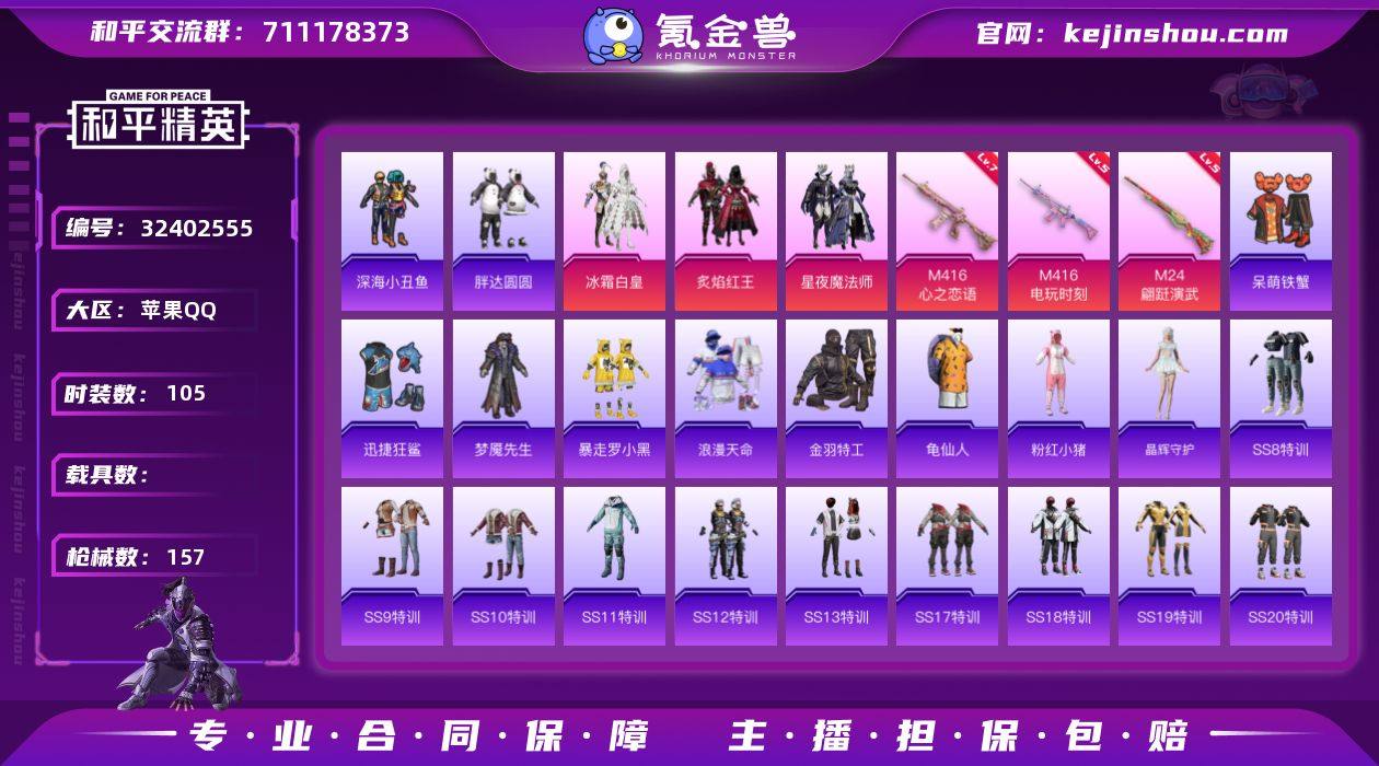 【FK6465】105套装/枪械5/装备161/战备102/王牌印记7/热力值47340/七级M416-心之恋语/五级M416-电玩时刻/五级UMP45-萌骑冒险/五级M24-翩跹演武/四级Mk14-福马献瑞/浪漫天命/深海小丑鱼/胖达圆圆/金羽特工/龟仙人/粉红小猪/冰霜白皇/炙焰红王/星夜魔法师/M416心之恋语/M416电玩时刻/UMP45-萌骑冒险/M24翩跹演武/Mk14-福马献瑞/飞行器-天之羽翼/星夜魔法师飞行翼/飞行器-闪光银龙/梦幻火箭降落伞/四圣焕新降落伞/橘柚倾心降落伞/筑梦精灵降落伞/炙焰牛王降落伞/太空嘟嘟降落伞/旋转彩虹降落伞/音爆索尼克降落伞/晶辉守护/套装-雨过天青/套装-红釉青花/角色-唐三/AKM-夜灯/AKM-彩虹符号/AKM-灼热熔岩/AKM-破晓战魂/AKM-缤纷海域/AKM-龙的传人/M16A4-幻世战舞者/M16A4-甜心亚梦/M16A4-红色方程式/SCAR-L-玉兔迎春/SCAR-L-红色方程式/SCAR-L-青丘仙客/M416-夜灯/M416-月影鸳鸯/M416-糯团青竹/M416-红色方程式/M416-蓝色火焰/GROZA-影袭/GROZA-恐龙拽拽/GROZA-田园牧歌/GROZA-黑色刀锋/AUG-辉耀战甲/AUG-天降萌叽/AUG-耀粉歌者/QBZ-原初圣火/QBZ-彩虹符号/QBZ-未来歌姬/QBZ-洛神天依/QBZ-飞驰魅影/M762-乘风破浪/M762-天降萌叽/M762-牛气冲天/M762-瑞龙福将/Mk47-天之羽翼/MK47-妙红...