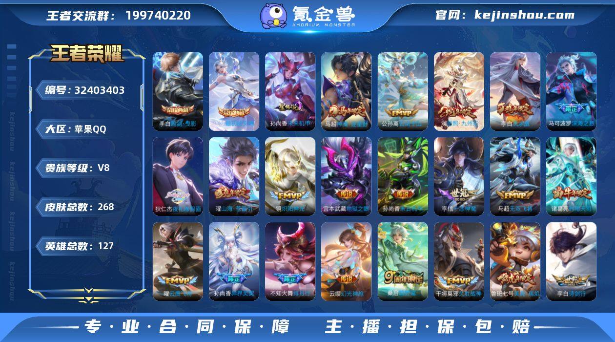 苹果Q-V8-永恒钻石II段位-111英雄-116皮肤-1典藏皮肤-1典藏英雄-1无双-14传说-27史诗 【荣耀典藏】:武则天英雄,孙悟空全息碎影 LK262187 【无双皮肤】:孙悟空无相 【传说皮肤】:小乔山海琳琅生,小乔音你心动,镜炽阳神光,虞姬启明星使,曜云鹰飞将,貂蝉猫影幻舞,虞姬云霓雀翎,达摩黄金狮子座,貂蝉仲夏夜之梦,孙尚香末日机甲,宫本武藏地狱之眼,孙悟空地狱火,武则天海洋之心,狄仁杰超时空战士 【限定皮肤】:狄仁杰阴阳师,小乔山海琳琅生,赵云皇家上将,芈月重明,吕布猎兽之王,周瑜赤莲之焰,夏侯惇朔风刀,狄仁杰魔术师,狄仁杰万华元夜,项羽海滩派对,老夫子醍醐杖,兰陵王驯魔猎人,虞姬启明星使,鬼谷子原初探秘者,弈星混沌棋,沈梦溪星空之诺,明世隐疑决卦,盾山御銮,上官婉儿梁祝 【年限皮肤】:小乔山海琳琅生 【赛季限定】:芈月重明,盾山御銮,夏侯惇朔风刀,弈星混沌棋,明世隐疑决卦,老夫子醍醐杖,鬼谷子原初探秘者,狄仁杰万华元夜,亚瑟荣光之誓 【战令限定】:吕布猎兽之王,兰陵王驯魔猎人,周瑜赤莲之焰,沈梦溪星空之诺,莱西奥光弋星穹,明世隐往忆晖光,周瑜线条小狗,小乔线条小狗 【史诗皮肤】:鲁班七号电玩小子,露娜紫霞仙子,赵云皇家上将,王昭君偶像歌手,狄仁杰魔术师,廉颇地狱岩魂,宫本武藏鬼剑武藏,孙尚香水果甜心,妲己魅力维加斯,墨子龙骑士,墨子金属风暴,曹操幽灵船长,李白千年之狐,刘邦德古拉伯爵,夏侯惇乘风破浪,亚瑟心灵战警,雅典娜冰冠公主,百里守约特工魅影,蔡文姬舞动绿茵,李元芳逐浪之夏,白起星夜王子,狄仁杰鹰眼统帅,兰陵王驯魔猎人,上官婉儿梁祝,狂铁龙之律动,莱西奥光弋星穹,小乔线条小狗,周瑜线条小狗 【其他皮肤】:项羽海滩派对,韩信教廷特使,韩信街头霸王,露娜哥特玫瑰,阿轲爱心护理,赵云白执事,芈月红桃皇...