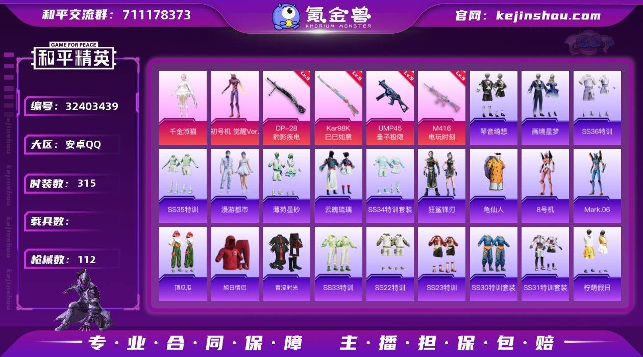 0载具-86套装-112枪皮-12王牌印记-2粉装-7特效枪-35473热力值-86套装-112枪皮-6卓越印记-2传奇印记【2粉装】角色-初号机 觉醒Ver.,角色-千金淑猫【7特效枪】UMP45-量子极限/5级,ACE32-萌骑漫游/5级,AA12-G-萌骑幻想/1级,PKM-萌骑夺宝/2级,DP-28-豹影疾电/5级,M416-电玩时刻/5级,Kar98K-巳巳如意/5级【3稀有紫装】Mark.06,8号机,龟仙人【86稀有时装】初号机 觉醒Ver.,SS35特训,SS31特训,SS33特训,SS32特训,SS36特训,琴音绮想,恋语绒绒,画境星梦,星影赞美诗,SS34特训,狂鲨锋刃,大橘大利,龟仙人,Mark.06,8号机,云魄琉璃,炫彩糖果,漫游都市,薄荷星砂,顶瓜瓜,雪国风尚,千金淑猫,龙魂突击队,异域银装,街头风暴,糖霜甜心,冰河战士,SS30特训,拉斐尔,战术大师,智谋强哥,雏菊兔兔,香桃花海,巳巳如意,曼妙人鱼,SS28特训,SS29特训,萝兰蝴蝶,贝斯之夜,焰鹰斗篷,龙的传人,萌黄之夏,SS37特训,蝶吟花词,白色伏地魔,湖蓝色名流,涂山之恋,SS26特训,空岛之星,热情海星,纯真浪花,竞技名士,猛禽,长空猛禽,特战装甲,旭日情侣,街头潮人,魅力单车,春光漫游,青涩时光,龙腾端午,狙击之神,红熊茄茄,完美偶像,幽夜迷踪,破蛋小黄鸡,疯狂小兔子,快闪甜心,野性战心,海岛探路者,烈火街头,SS27特训,竞技角斗士,...