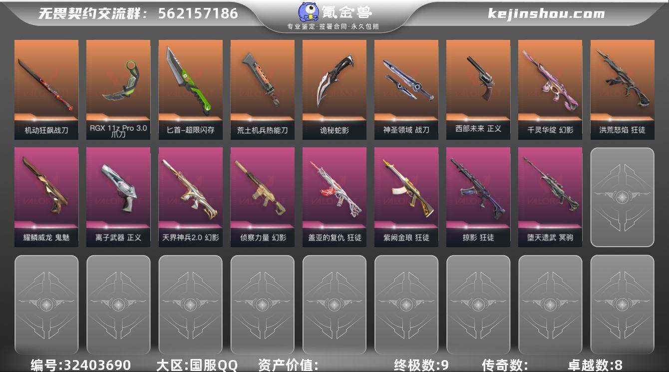 【英雄】:幻棱,炼狱,维斯,暮蝶,钛狐,壹决,铁臂,捷风,雷兹,幽影,不死鸟,贤者,猎枭,蝰蛇,零,芮娜,奇乐,尚勃勒,霓虹,斯凯,夜露,星礈,K/O,海神,盖可,黑梦,钢锁 【近战 武器】:近战武器-RGX 11z Pro//3.0 爪刀,近战武器-超限闪存 匕首,近战武器-荒土机兵 热能刀,近战武器-机动狂飙 战刀,近战武器-诡秘蛇影 军刀,近战武器-神圣领域 战刀 【狂徒】:狂徒-洪荒怒焰,狂徒-掠影,狂徒-盖亚的复仇,狂徒-紫阙金琅,狂徒-荒土机兵,狂徒-诡秘蛇影 【幻影】:幻影-千灵华绽,幻影-天界神兵//2.0,幻影-侦察力量,幻影-超限闪存,幻影-神圣领域,幻影-纳米打击,幻影-末日之翼 【戍卫】:戍卫-浮光跃金,戍卫-逆冲蛮牛,戍卫-月球哨兵,戍卫-折光棱晶 【獠犬】:獠犬-神圣领域,獠犬-模拟赫兹,獠犬-逆冲蛮牛 【冥驹】:冥驹-堕天遗武,冥驹-荒土机兵,冥驹-模拟赫兹,冥驹-星云暗涌 【飞将】:飞将-末日之翼 【莽侠】:莽侠-超限闪存,莽侠-诡秘蛇影,莽侠-月球哨兵 【战神】:战神-神圣领域,战神-浮光跃金 【奥丁】:奥丁-纳米打击,奥丁-末日之翼 【判官】:判官-诡秘蛇影,判官-纳米打击x 【雄鹿】:雄鹿-模拟赫兹,雄鹿-逆冲蛮牛,雄鹿-月球哨兵 【...