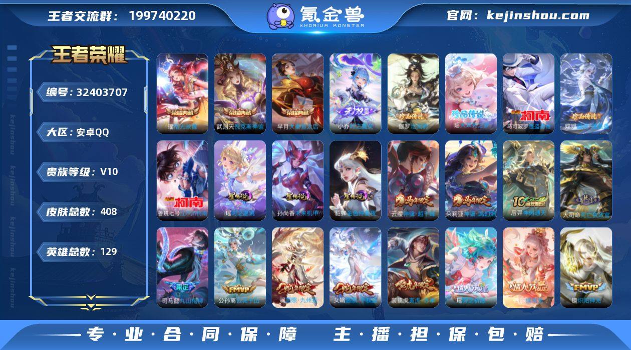王者19766,不可二次,20885流光积分,狸尾假日天幕,金虎啸春天幕,雪境奇遇小兵,30按键,彩标瑶,211夺宝,安卓Q-V10-至尊星耀I段位-129英雄-408皮肤-3典藏皮肤-1典藏英雄-1无双-5珍品传说-51传说-124史诗 【英雄全皮】:司马懿全皮,孙权全皮,娜可露露全皮,鬼谷子全皮,狂铁全皮,敖隐全皮,空空儿全皮,影全皮 【荣耀典藏】:武则天英雄,武则天倪克斯神谕,芈月大秦宣太后,瑶拾光映像 【无双皮肤】:小乔时之魔女 【珍品传说】:伽罗沧流箭,瑶大耳狗之梦,嫦娥器灵落星盏,鲁班七号江户川柯南,马可波罗怪盗基德 【传说皮肤】:云缨神骥越千峰,朵莉亚神骥鸣幻洲,后羿神树通天,大司命死亡执政官,司马懿九山相柳,公孙离云诺千山,西施续相思,女娲愿照千秋盛,澜愿照九州拓,云缨幻光神枪,王昭君映山客,桑启鸣野蒿,庄周牧神诗旅,艾琳觅芳踪,马可波罗妄想实况,公孙离记忆之芯,小乔山海琳琅生,李白诗剑行,娜可露露前尘镜,蔡文姬花朝如约,女娲补天,孙策末日机甲,瑶时之祈愿,裴擒虎寅虎赤拳,鲁班七号寅虎瑞焰,赵云淬星耀世,王昭君乞巧织情,西施游龙清影,周瑜音你心动,小乔音你心动,李元芳飞鸢探春,铠绛天战甲,镜炽阳神光,虞姬启明星使,曜云...