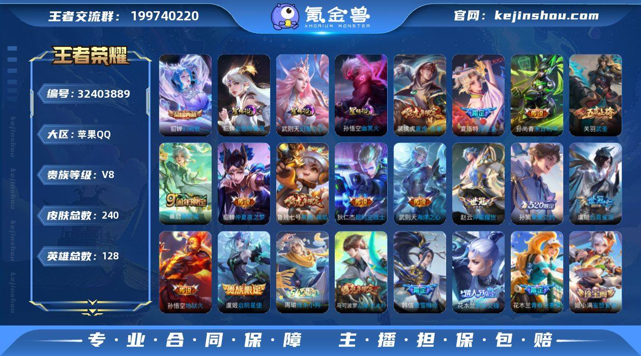 王者19768,不可二次,苹果Q-V8-最强王者段位-128英雄-240皮肤-1典藏皮肤-1典藏英雄-14传说-46史诗 【荣耀典藏】:武则天英雄,貂蝉幻阙歌 【传说皮肤】:桑启鸣野蒿,夏洛特浮生妄,孙策挚爱之约,裴擒虎寅虎赤拳,鲁班七号寅虎瑞焰,赵云淬星耀世,虞姬启明星使,关羽武圣,虞姬云霓雀翎,貂蝉仲夏夜之梦,孙尚香末日机甲,孙悟空地狱火,武则天海洋之心,狄仁杰超时空战士 【限定皮肤】:白起狰,狄仁杰阴阳师,虞姬凯尔特女王,赵云皇家上将,墨子神迹守卫,嬴政白昼王子,孙尚香蔷薇恋人,鲁班七号寅虎瑞焰,庄周蜃楼王,吕布猎兽之王,夏侯惇朔风刀,甄姬游园惊梦,曹操烛龙,典韦穷奇,马可波罗山海玄木吟,狄仁杰魔术师,狄仁杰万华元夜,达摩沙漠行僧,项羽海滩派对,老夫子醍醐杖,老夫子航海奇遇记,关羽武圣,程咬金演武夺筹,韩信傲雪梅枪,王昭君午后时光,兰陵王金庭之子,花木兰青春决赛季,花木兰默契交锋,亚瑟狮心王,牛魔御旌,后羿圣弓游侠,李元芳银河之约,李元芳云中旅人,虞姬启明星使,钟馗驱傩正仪,干将莫邪真爱魔法,雅典娜单词大作战,雅典娜黎明之约,太乙真人饕餮,鬼谷子原初探秘者,鬼谷子五谷丰年,苏烈千军破阵,弈星混沌棋,梦奇顽趣,...